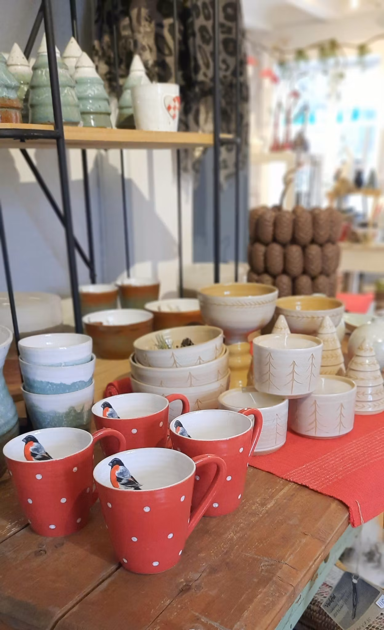 Krus i steingodsleire med julerød farge og hvite prikker.