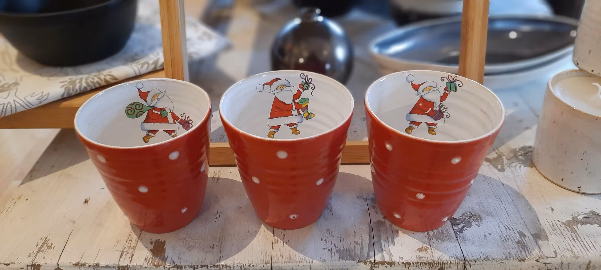Krus i steingodsleire med julerød farge og hvite prikker.