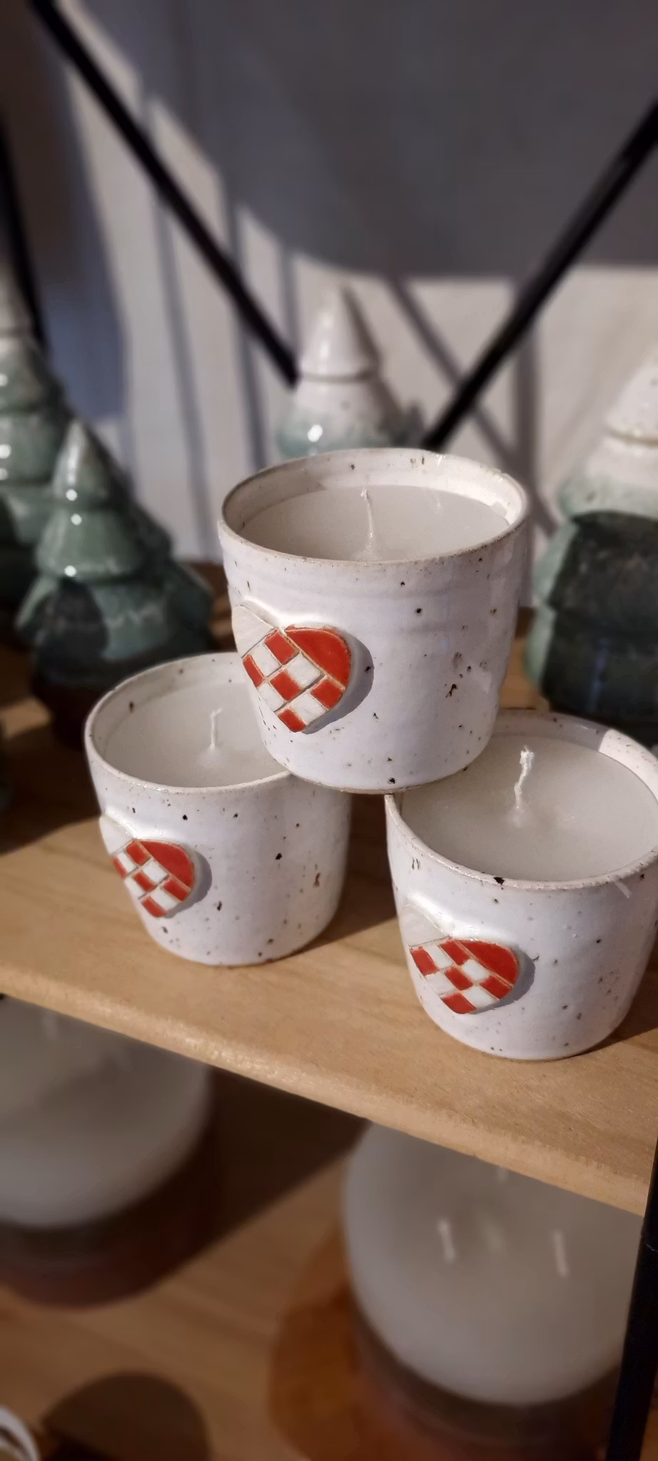Søt lyskrukke i steingodsleir i hvit glasur med et julekurv hjerte på fremsiden.