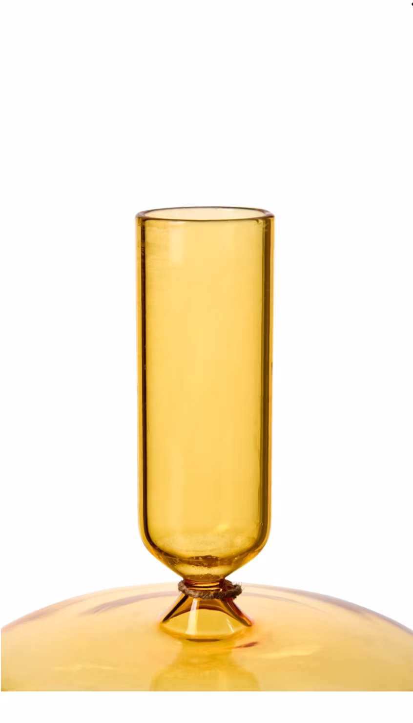 Munnblåst lysestake. Gul i fargen og moderne form.