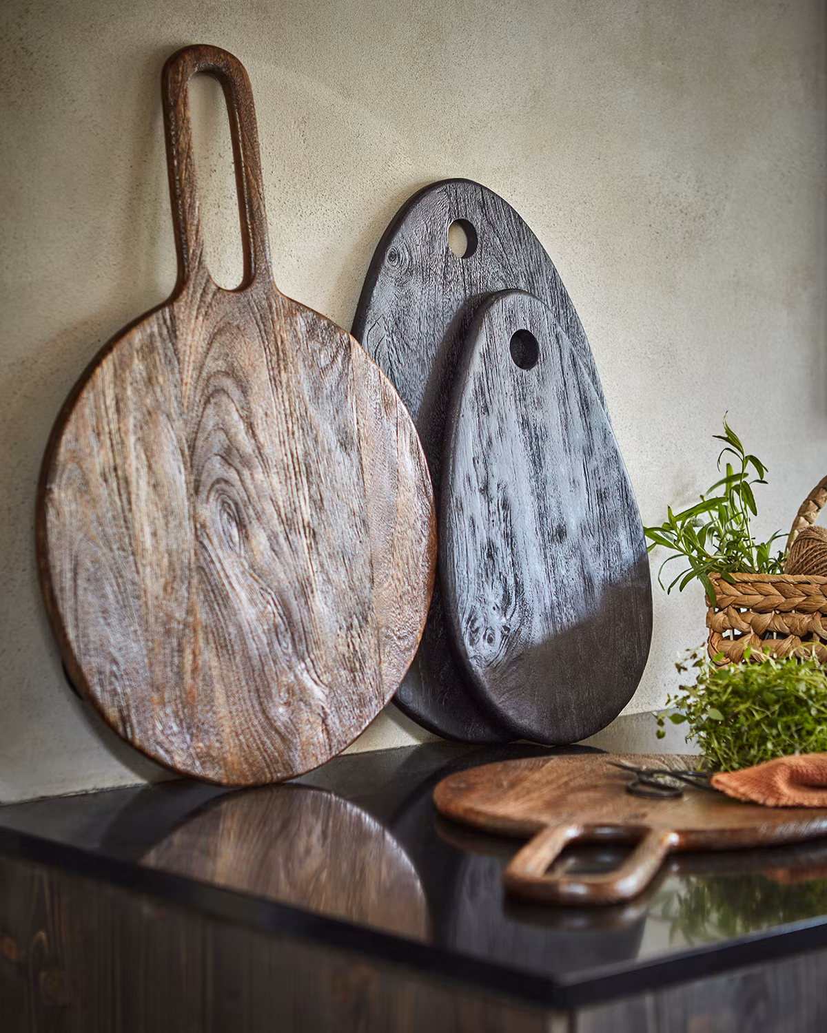 Superfin skjære fjøl i svart mango tre som også er et lekkert interiør innslag på kjøkkenet.