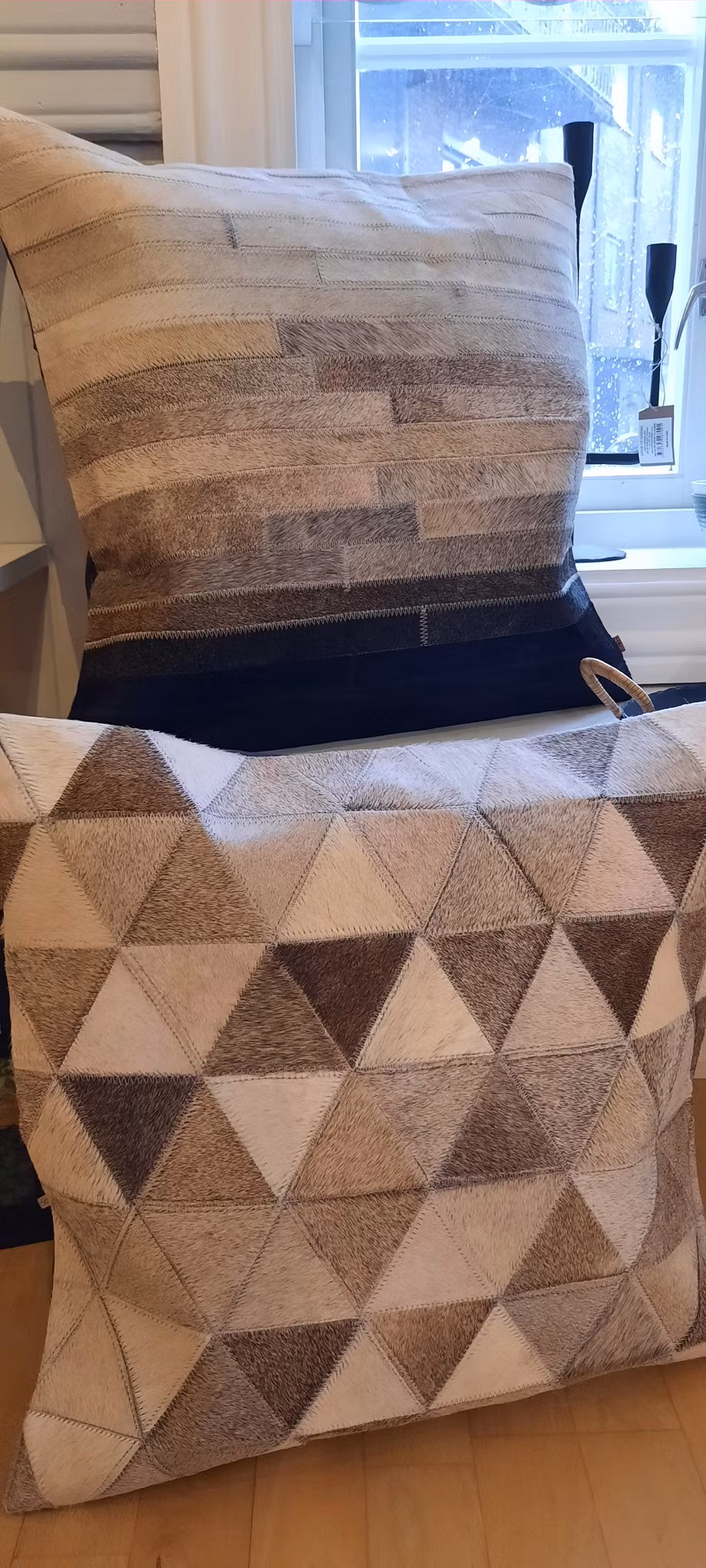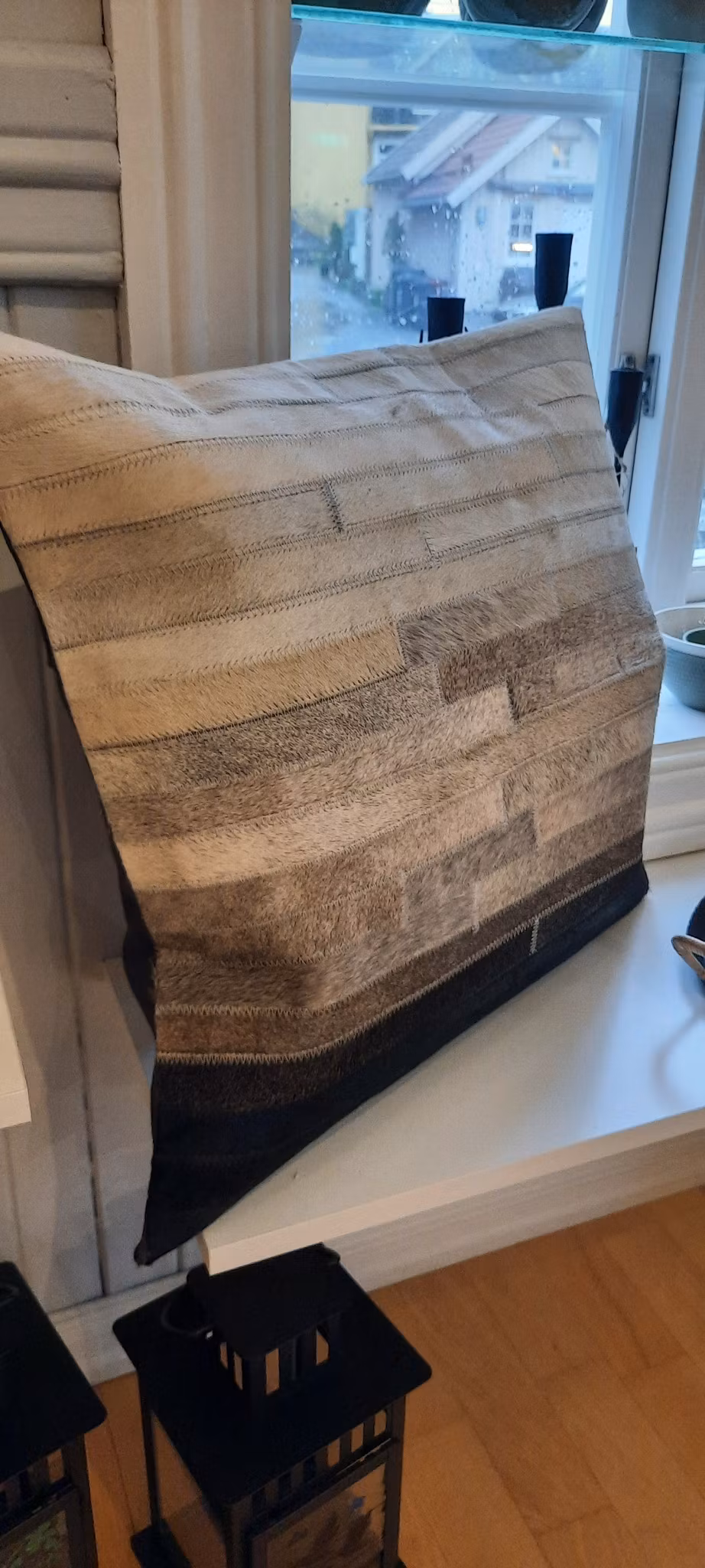 Kjempekult putetrekk fra Affari of Sweden i kuskinn. Vannrette striper i beigetoner til svart.