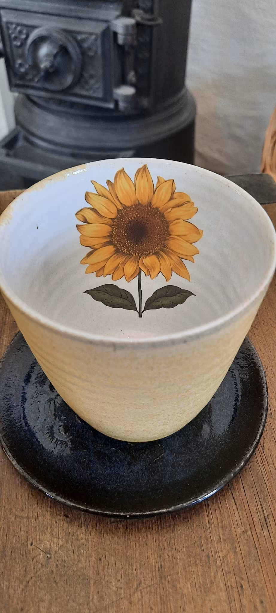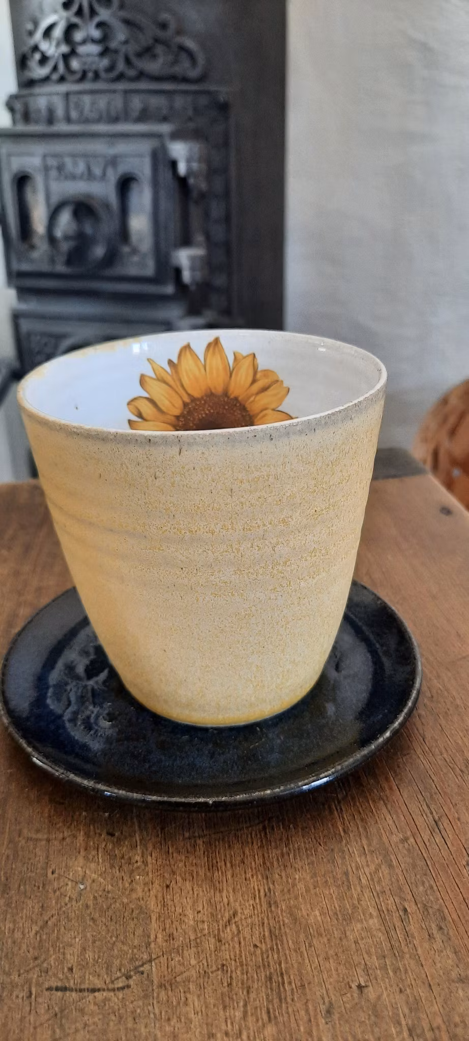 Kopp I steingodsleire. Rommer ca 2,5 dl. Gul i fargen.