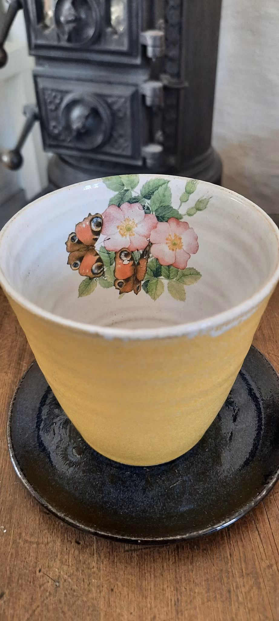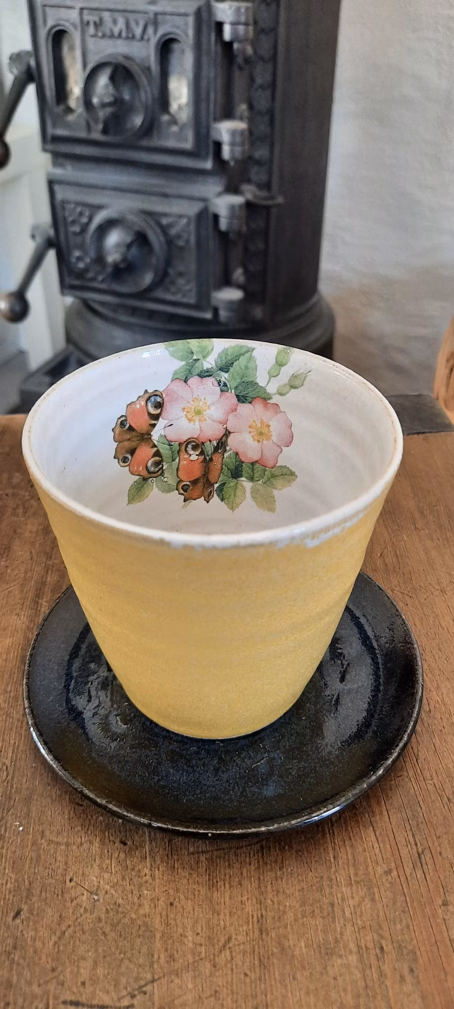 Kopp I steingodsleire. Rommer ca 2,5 dl. Gul i fargen.