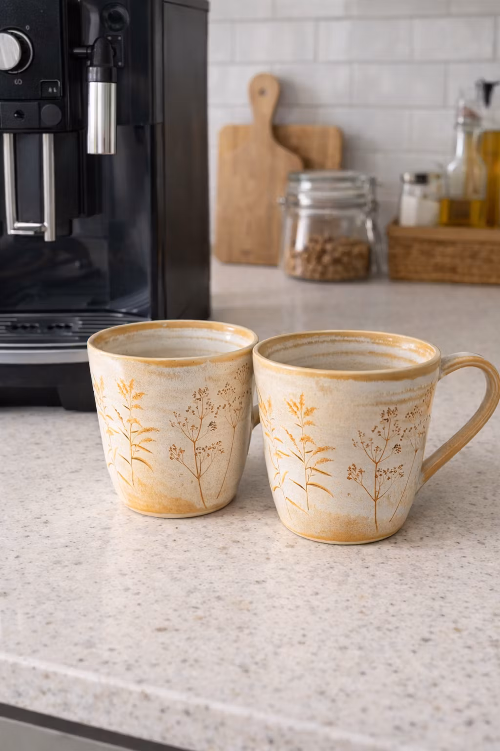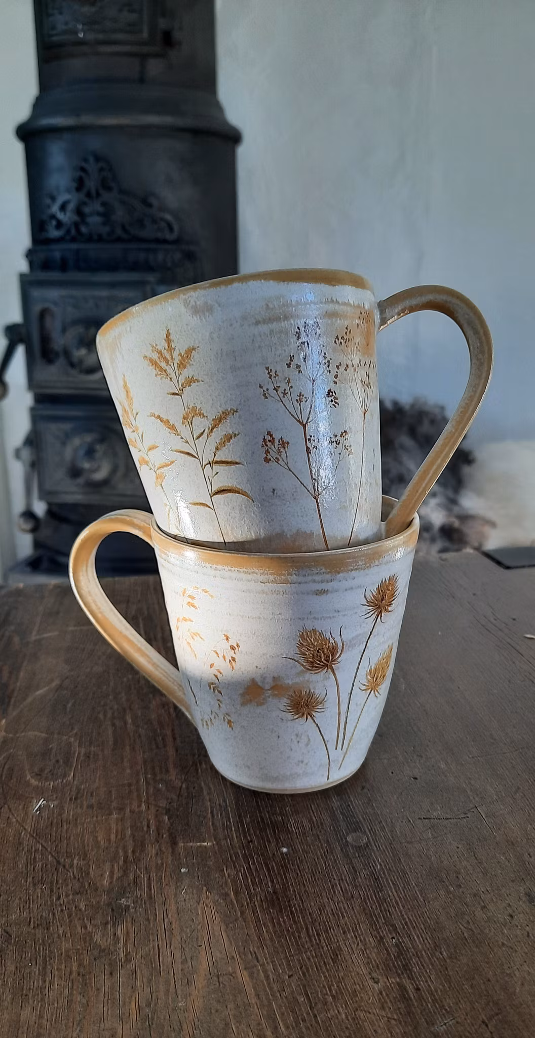 Kaffe kopp i steingodsleire med mønster av strå rundt hele koppen.