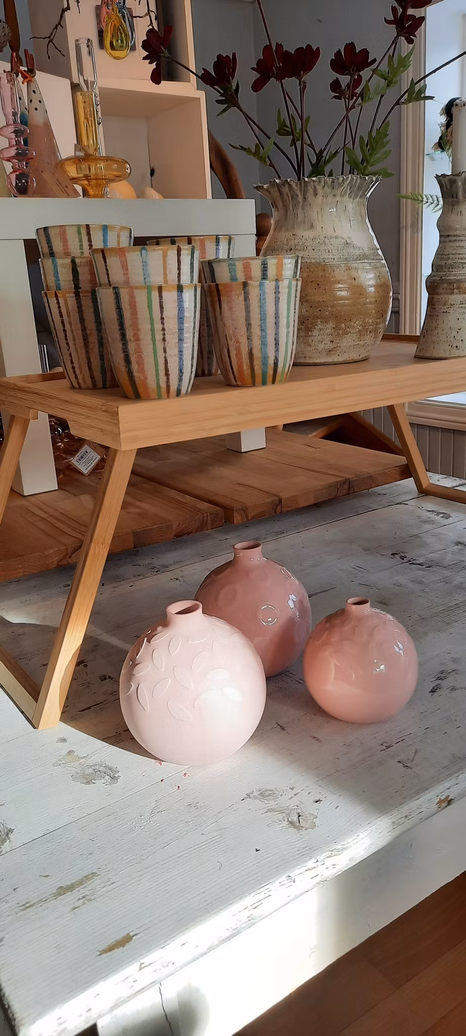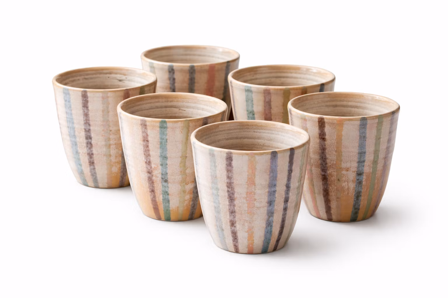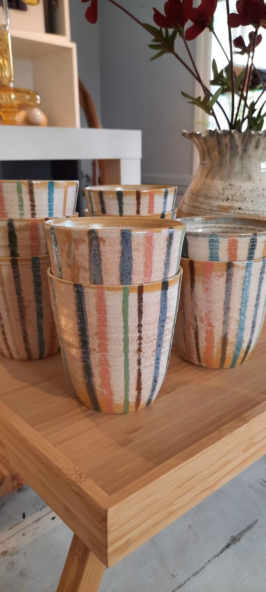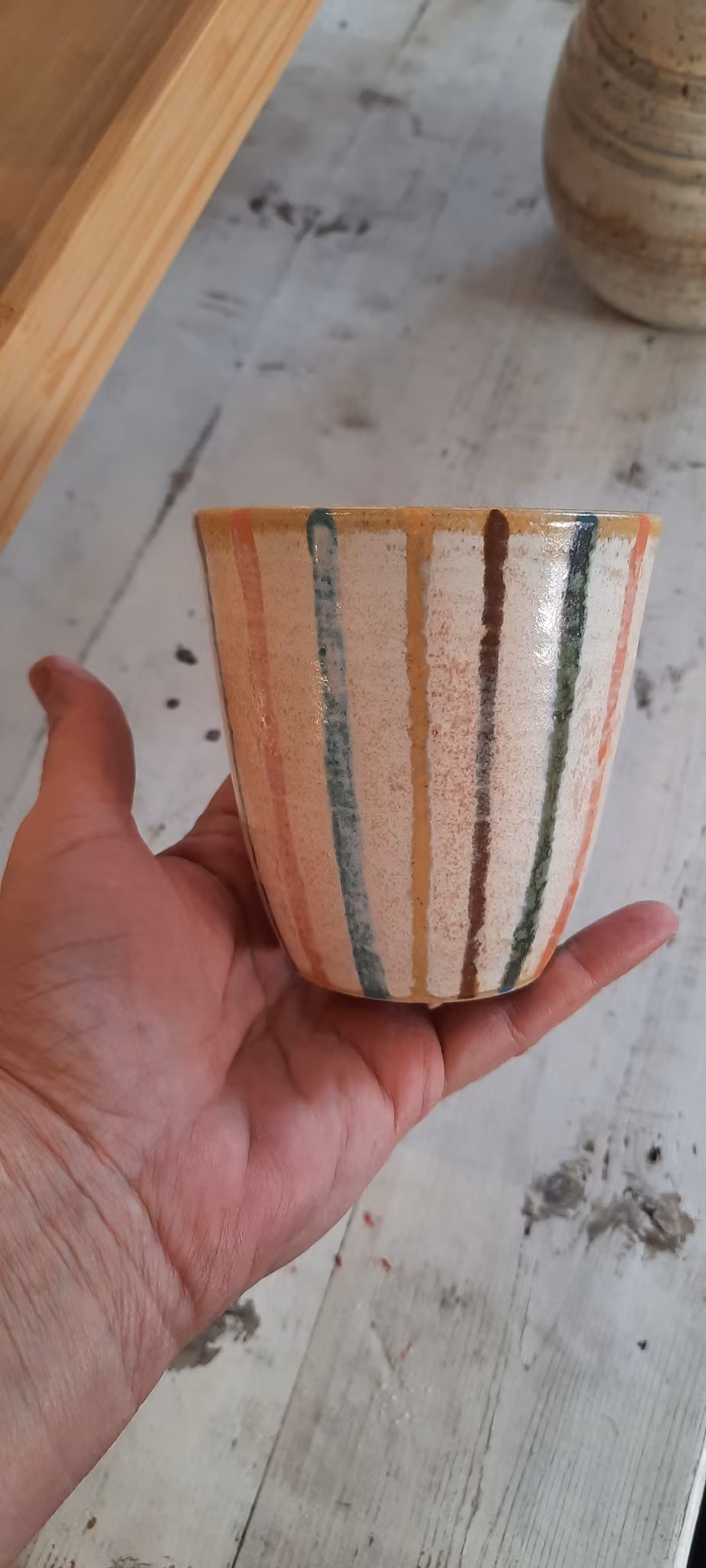 Krus i steingodsleire med håndmalte striper. Her er det innslag av mange farger.