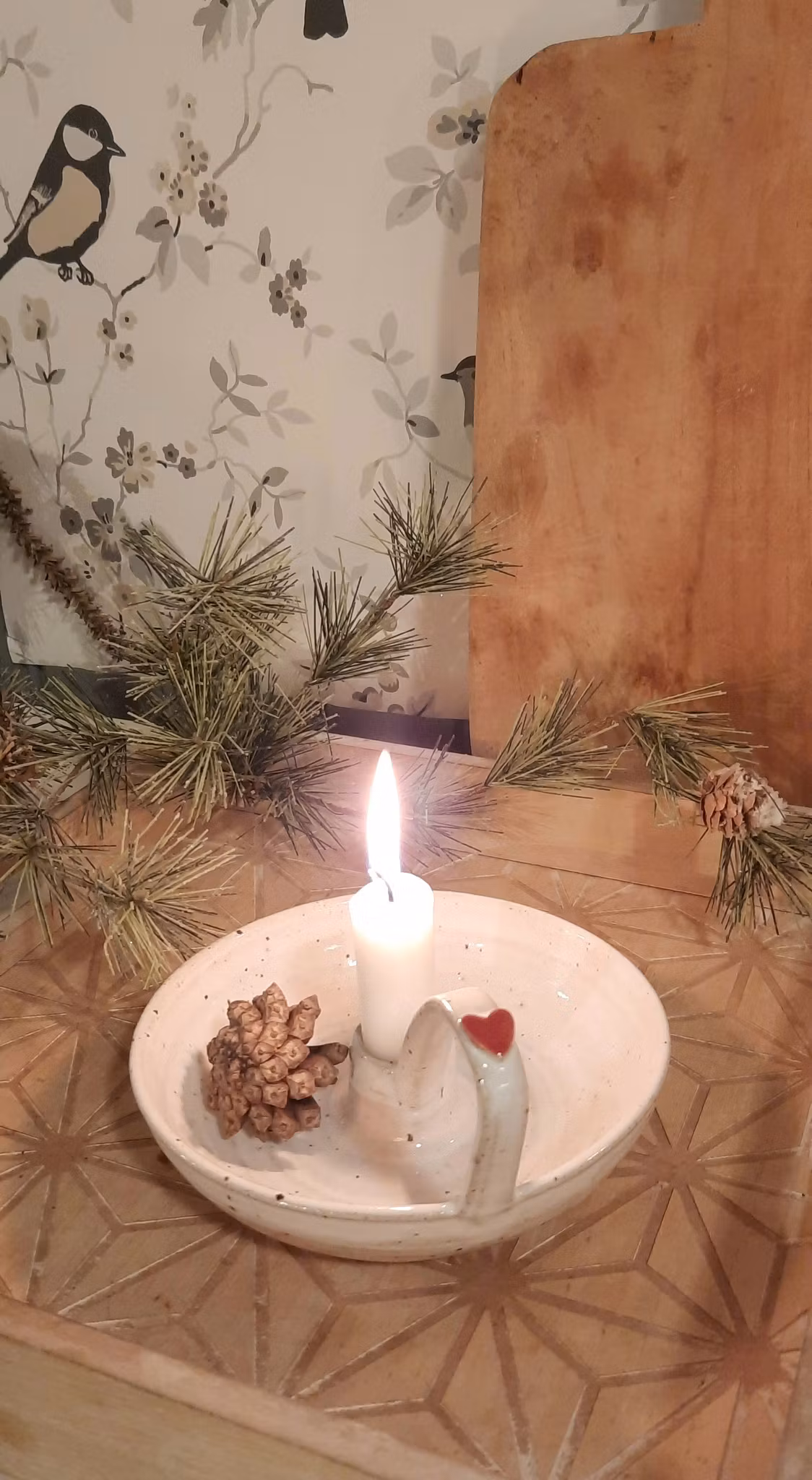 Lysestake med skål til pynting eller rennende stearin. Ca 14,5 cm i dia.