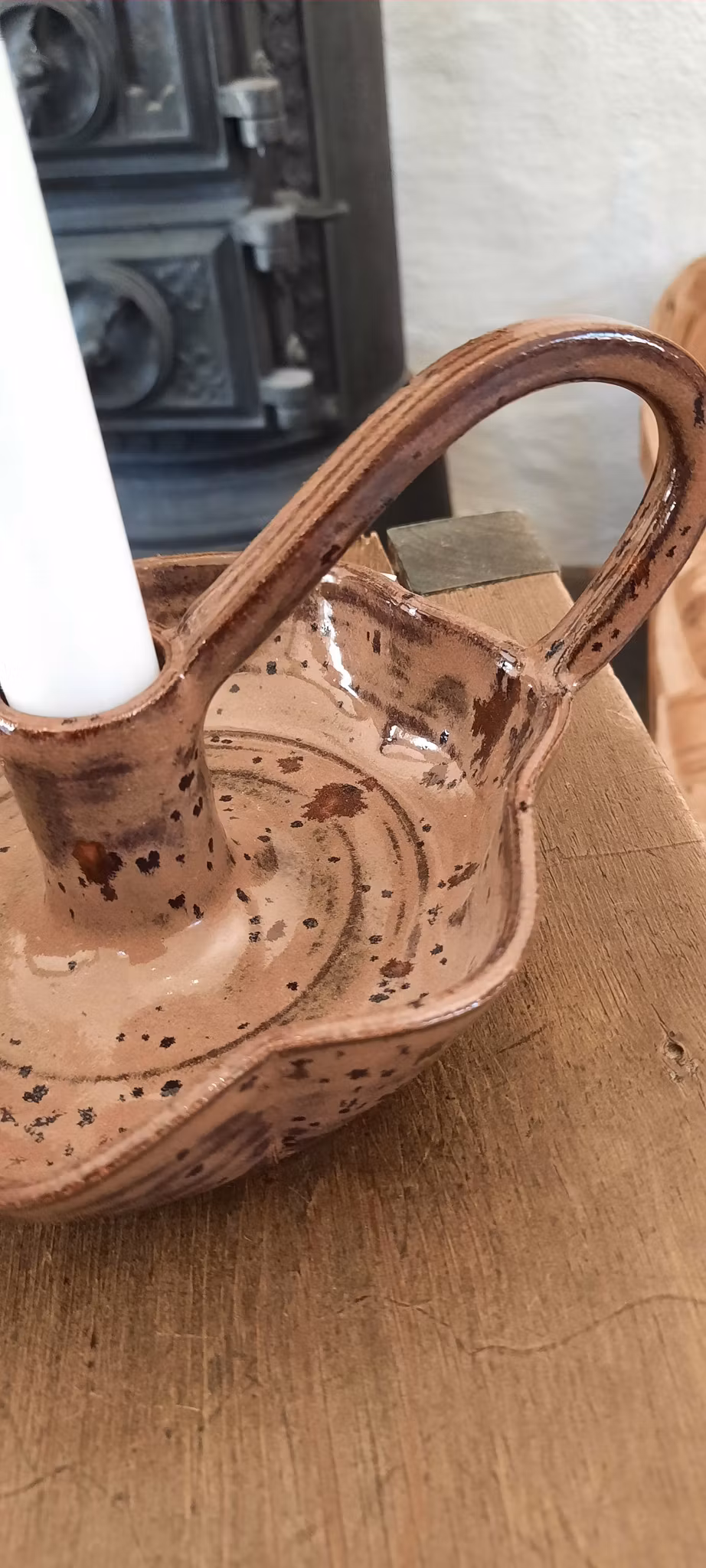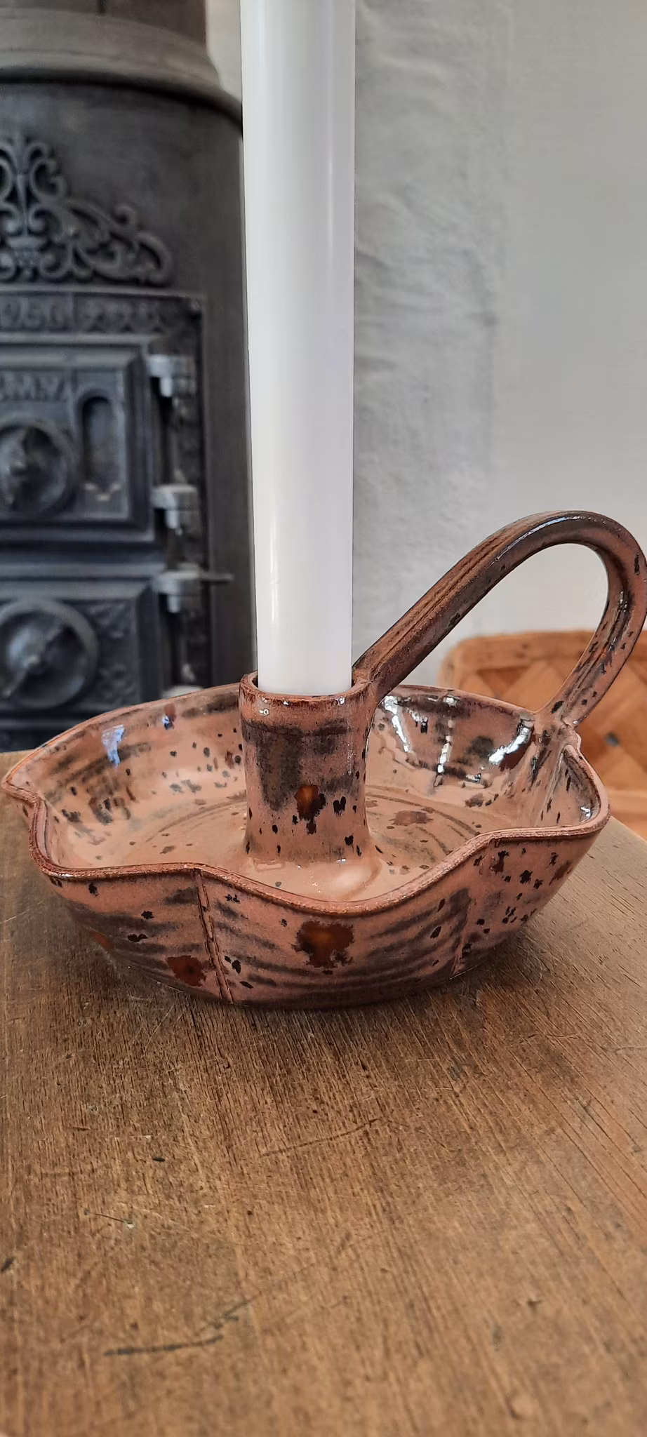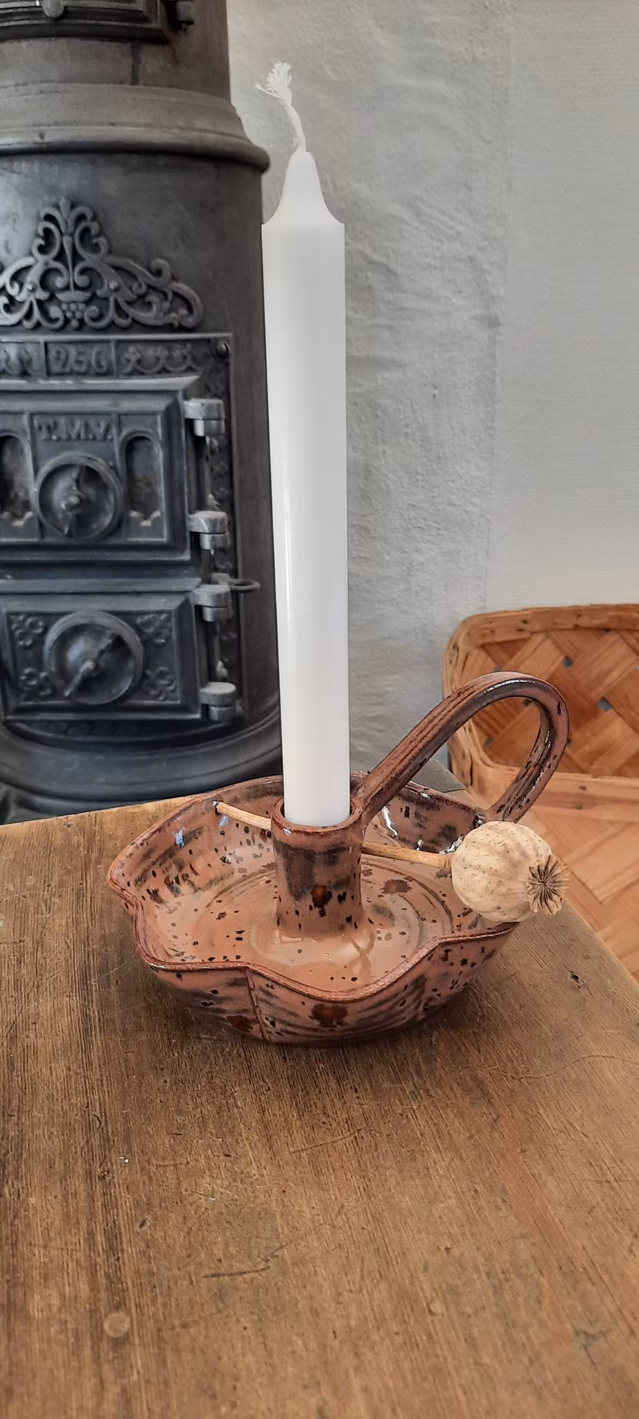 Lysestake med skål til pynting eller rennende stearin. Ca 14,5 cm i dia.