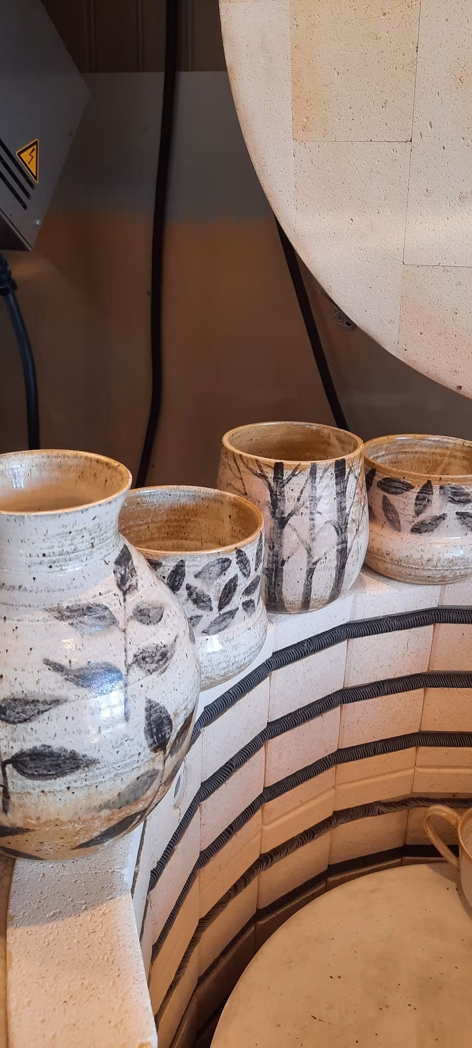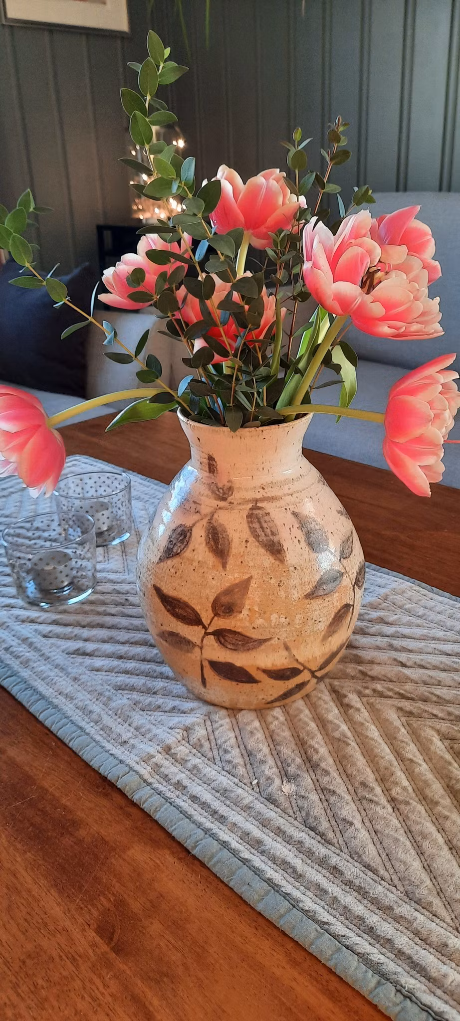 Unik vase med håndmalt bladmønster i steingodsleire.