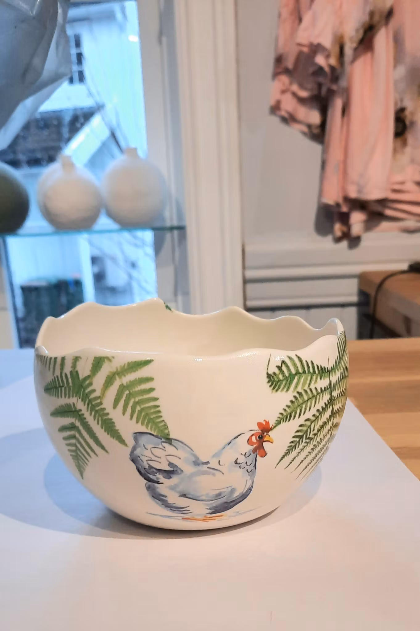 Morsom porselens skål med knekk kant som minner om knekt egg. Bregne og hønemotiver.