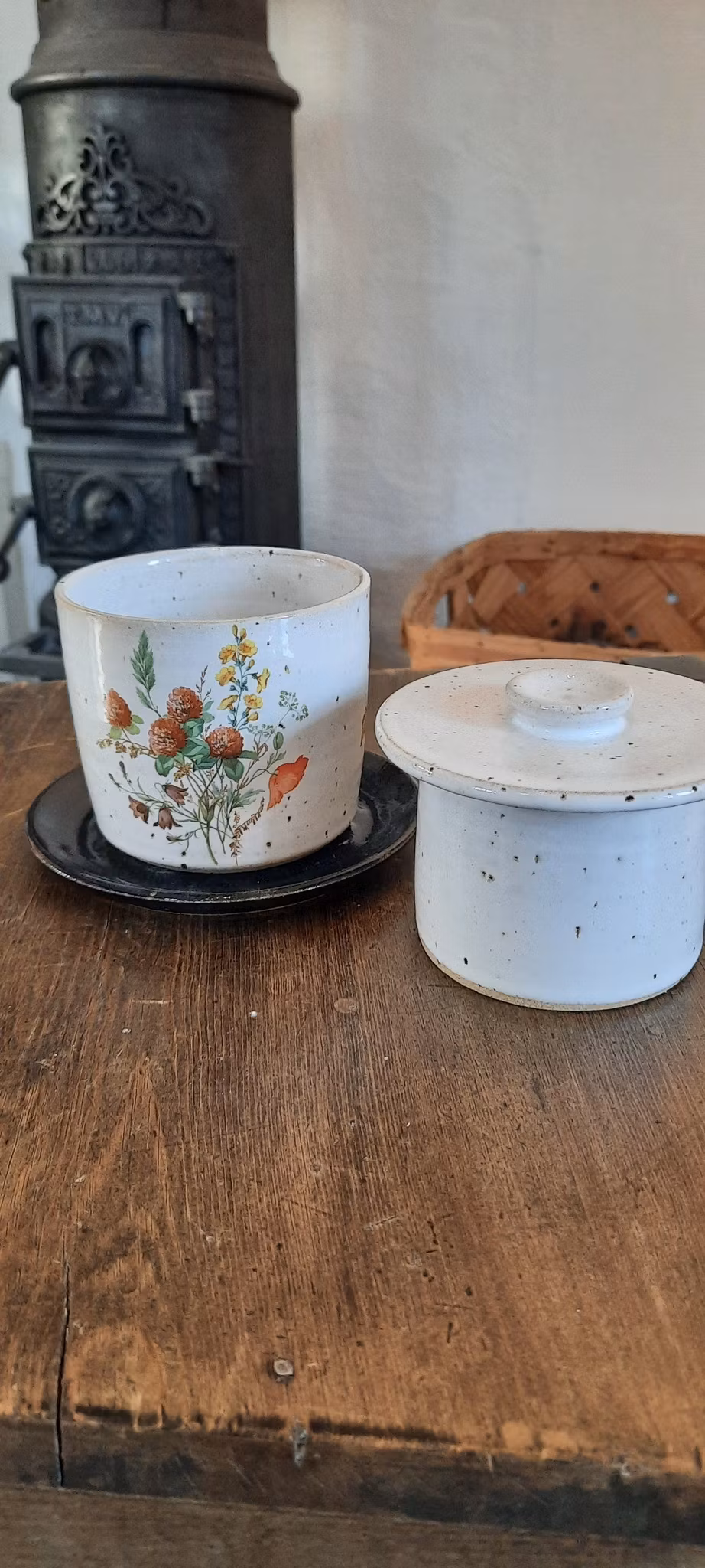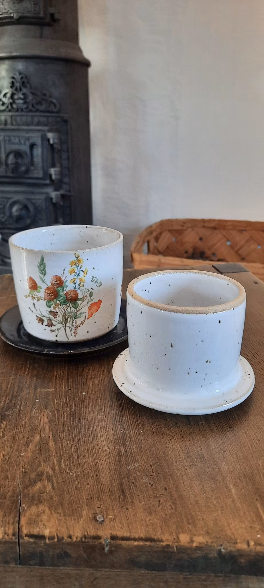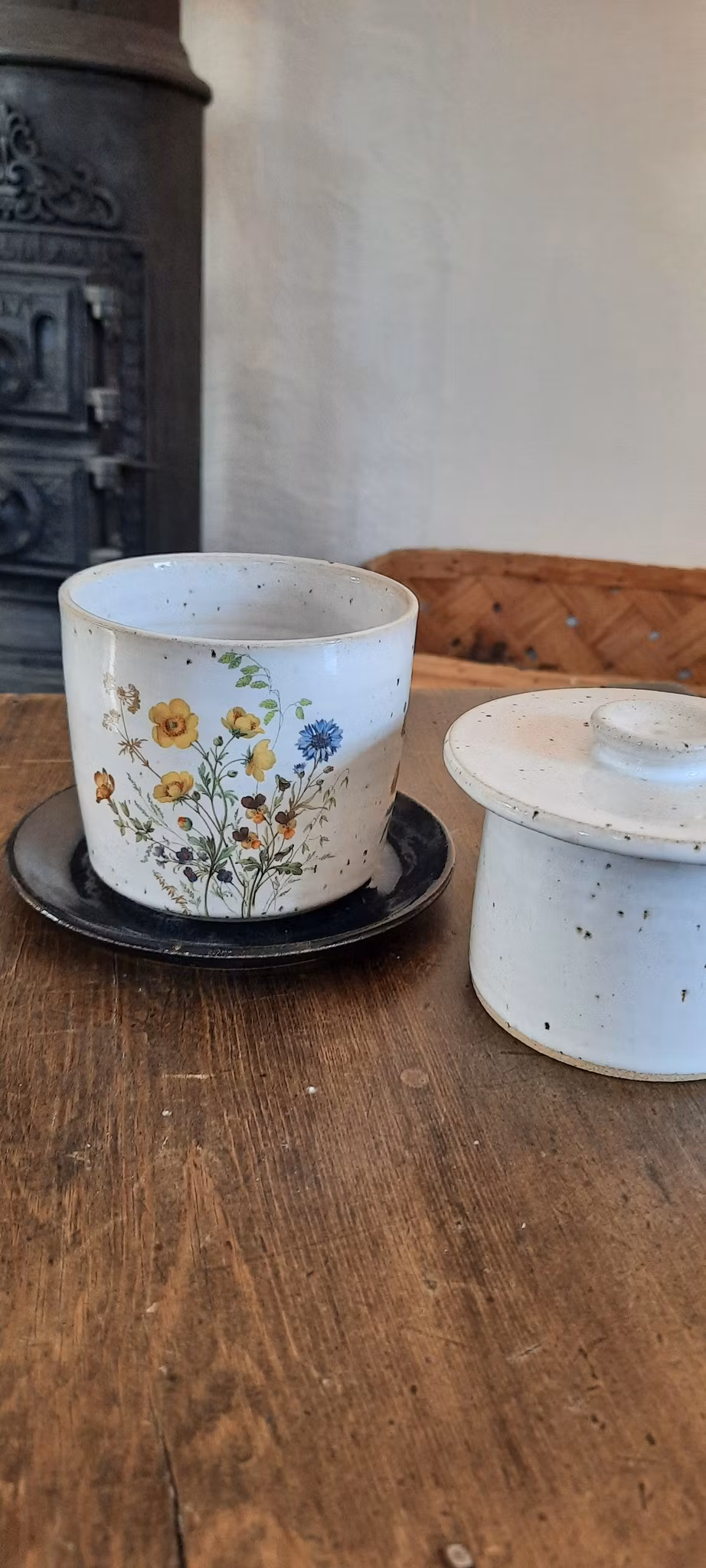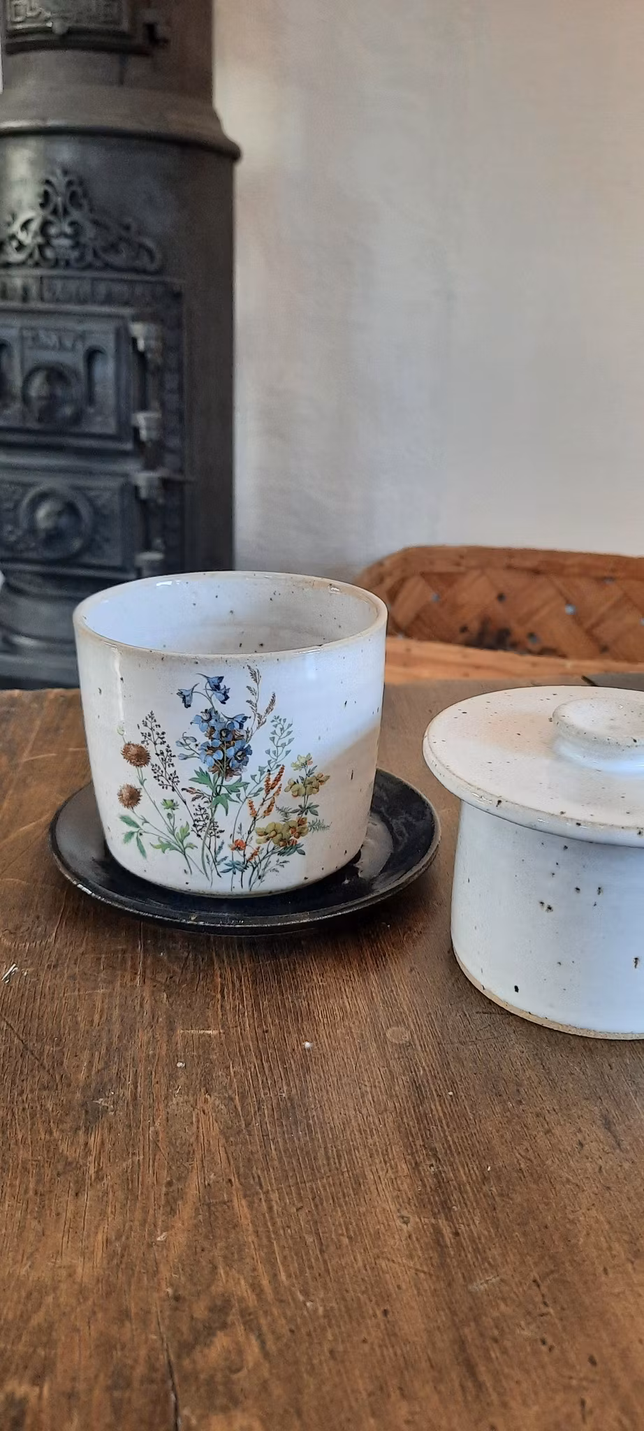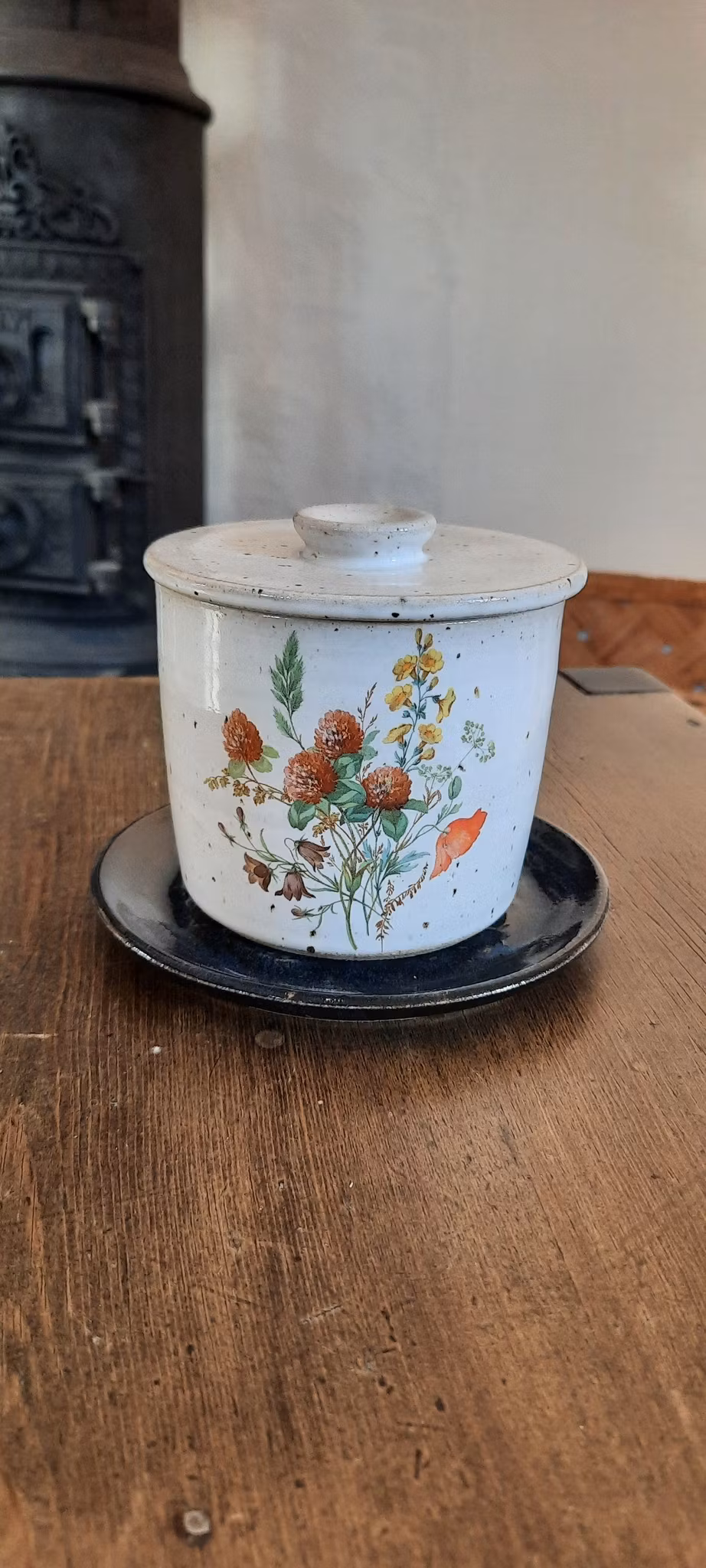 Smørkrukke i steingodsleire med 3 forskjellige villblomstmotiv rundt. Høyde ca.9 cm.