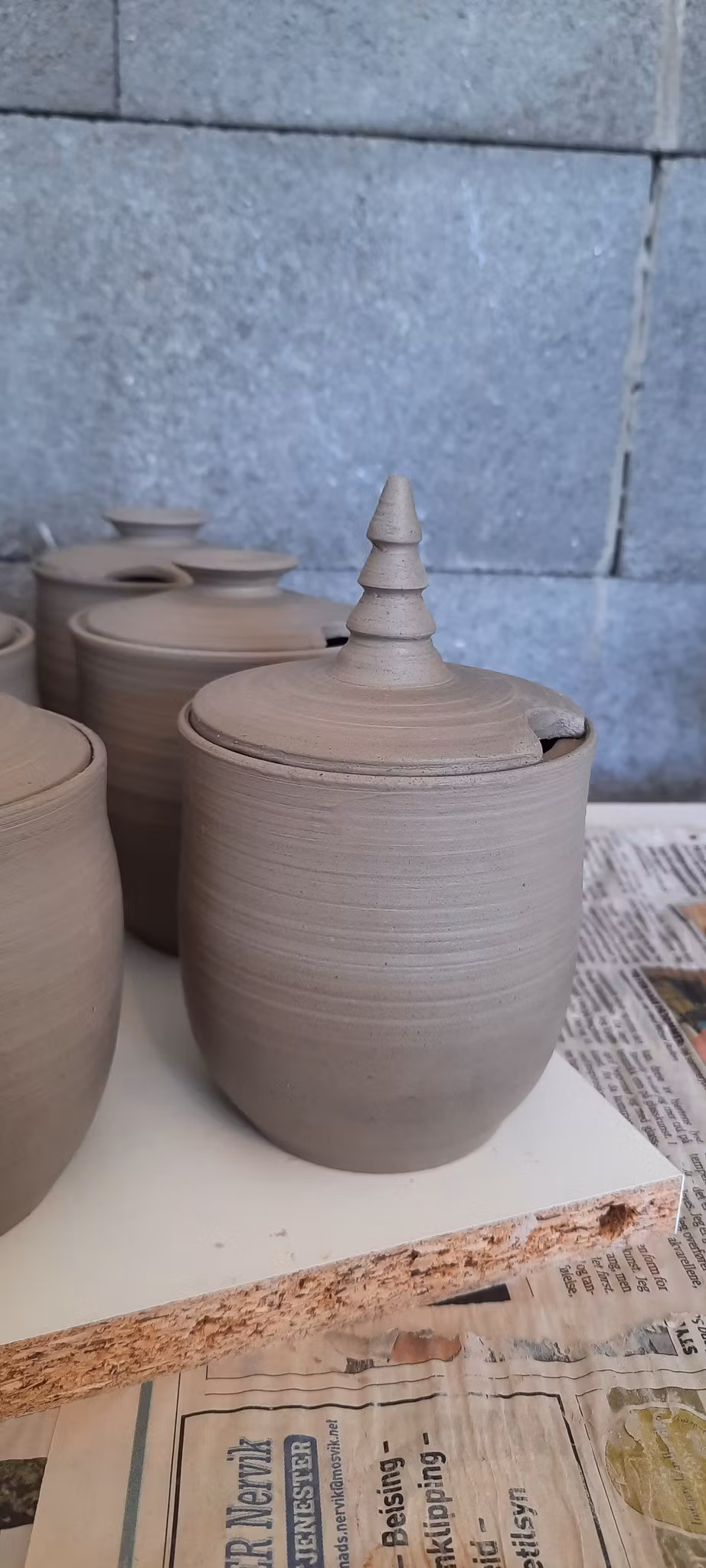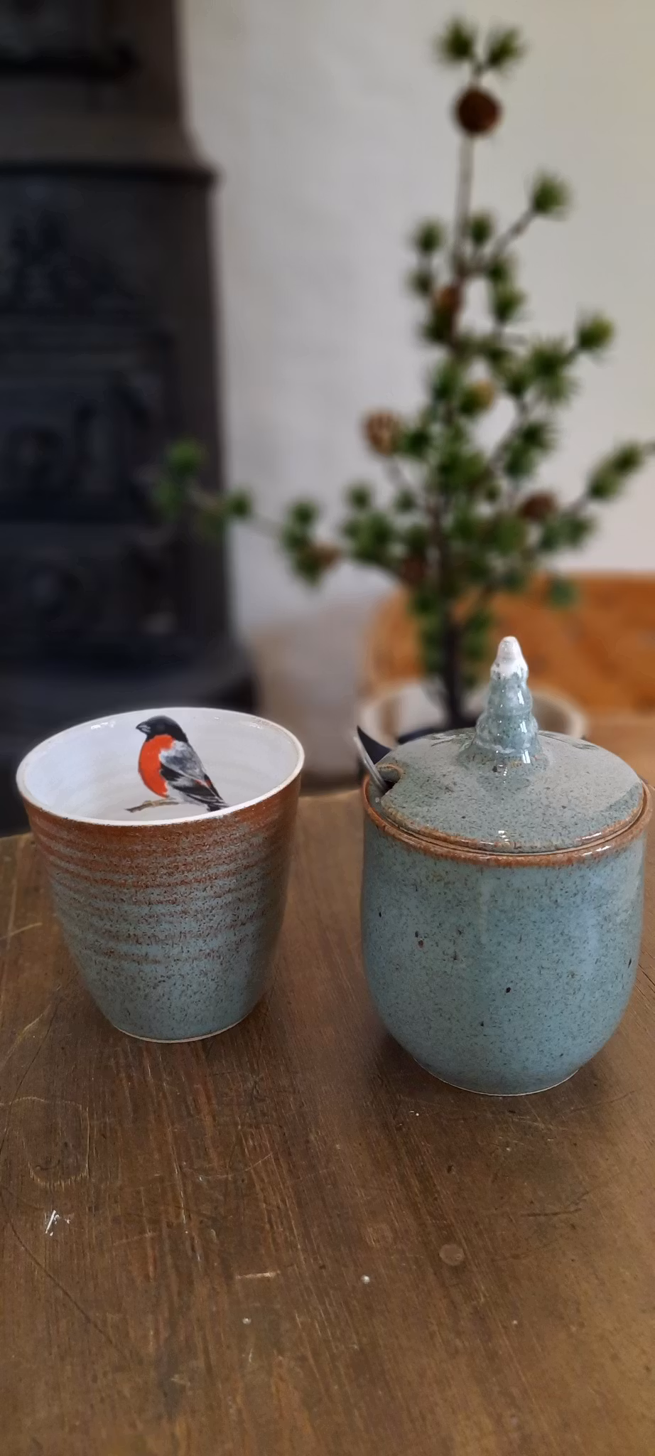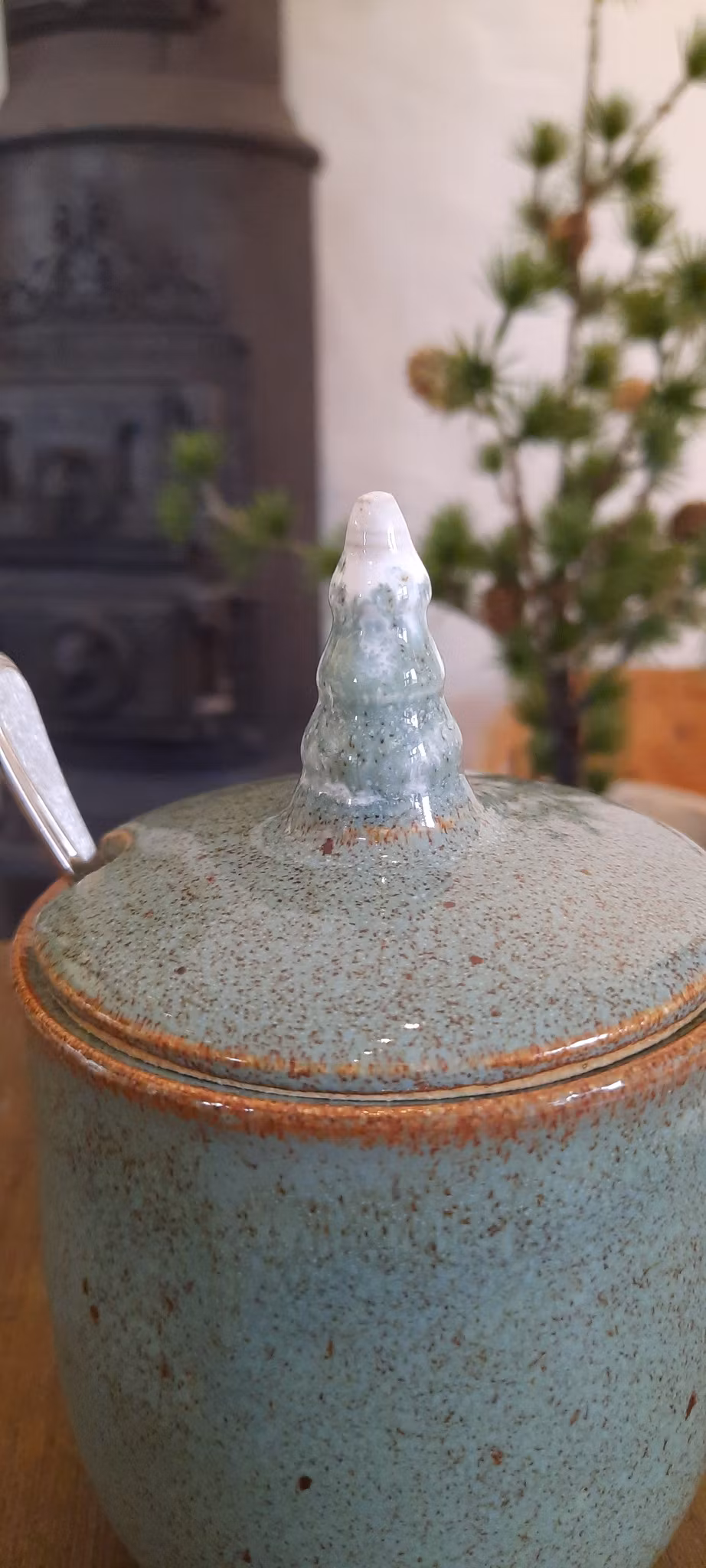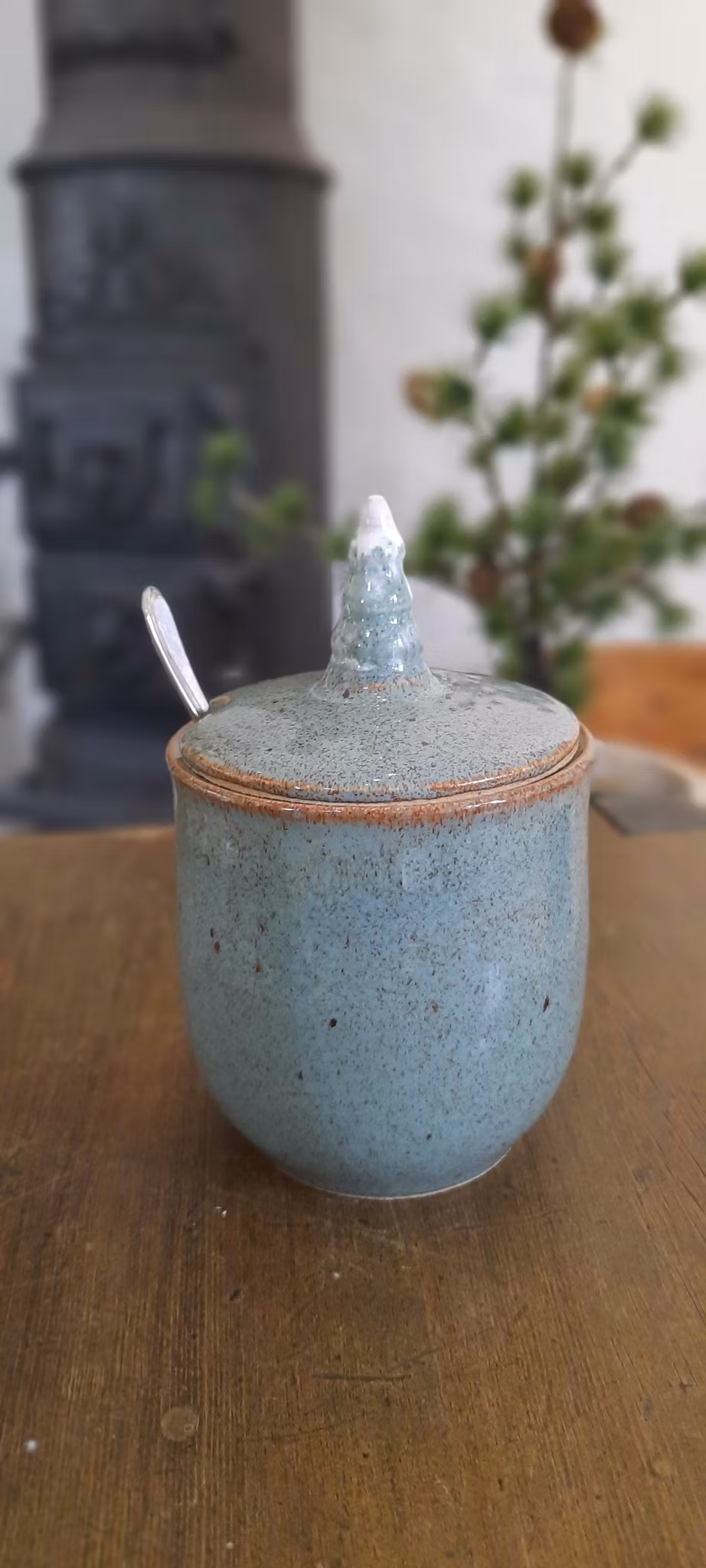 Sukkerkrukkei steingodsleire ca 9 -10 cm høy.