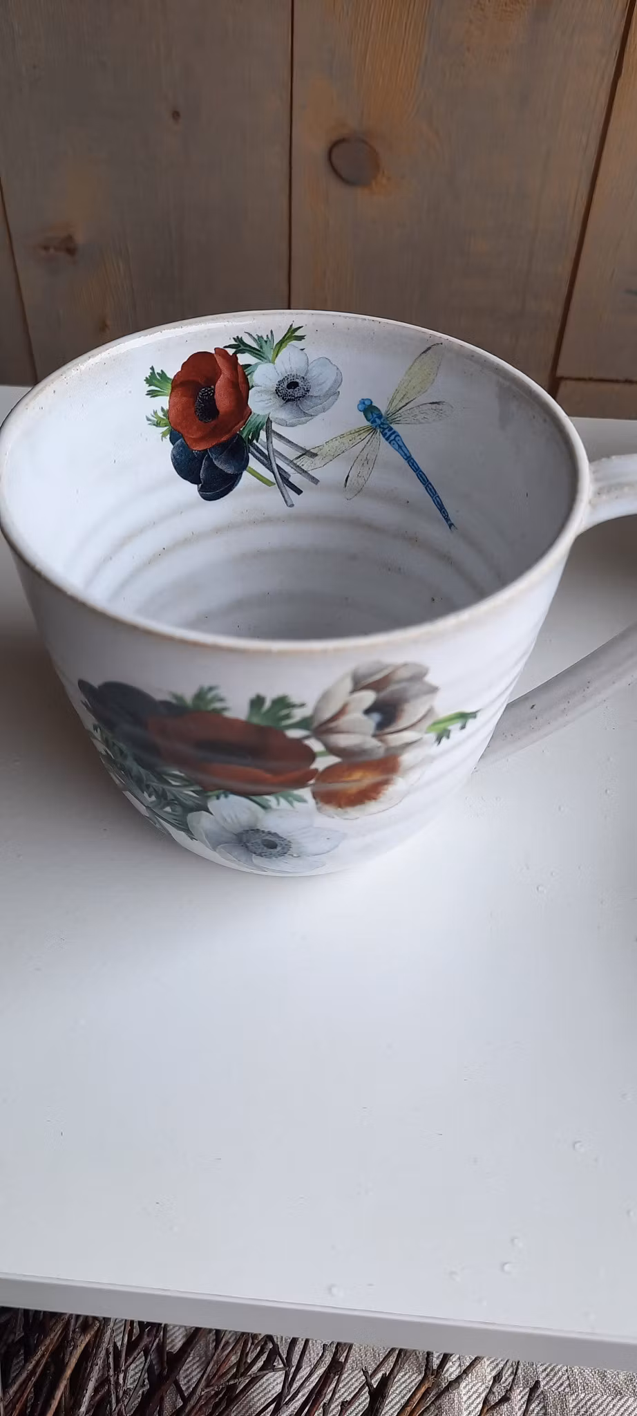 Stor kopp i steingodsleire. Hvit farge og rommer 4 dl.