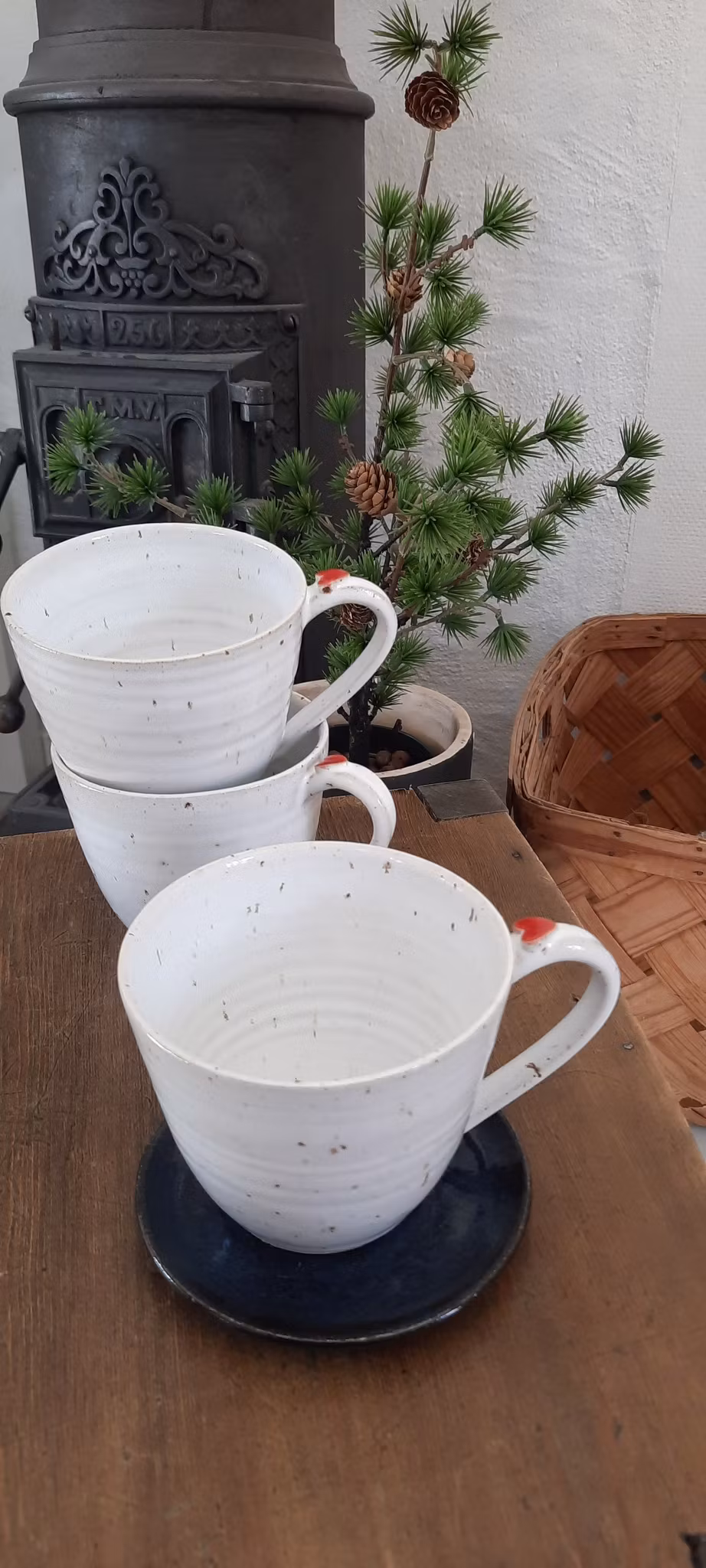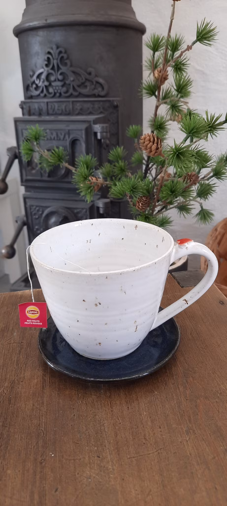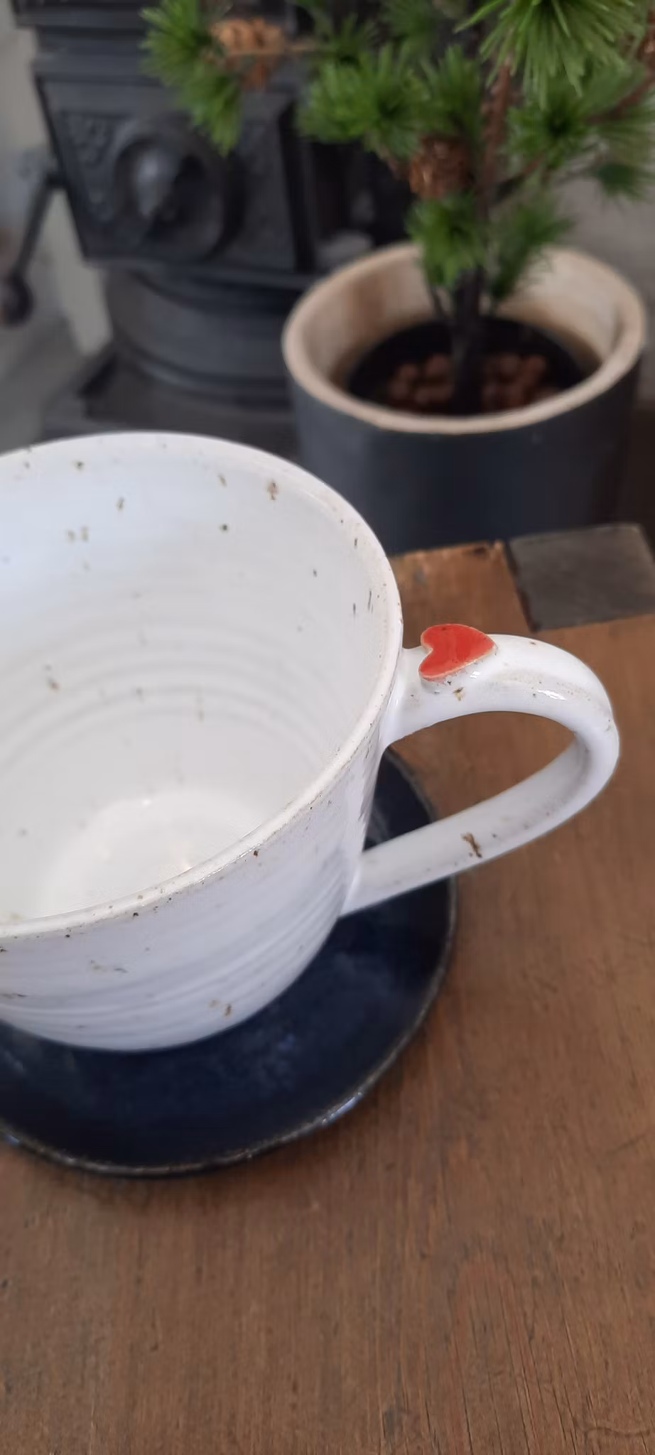 Stor kopp i steingodsleire. Hvit farge med rødt hjerte på hanken og rommer 4 dl.