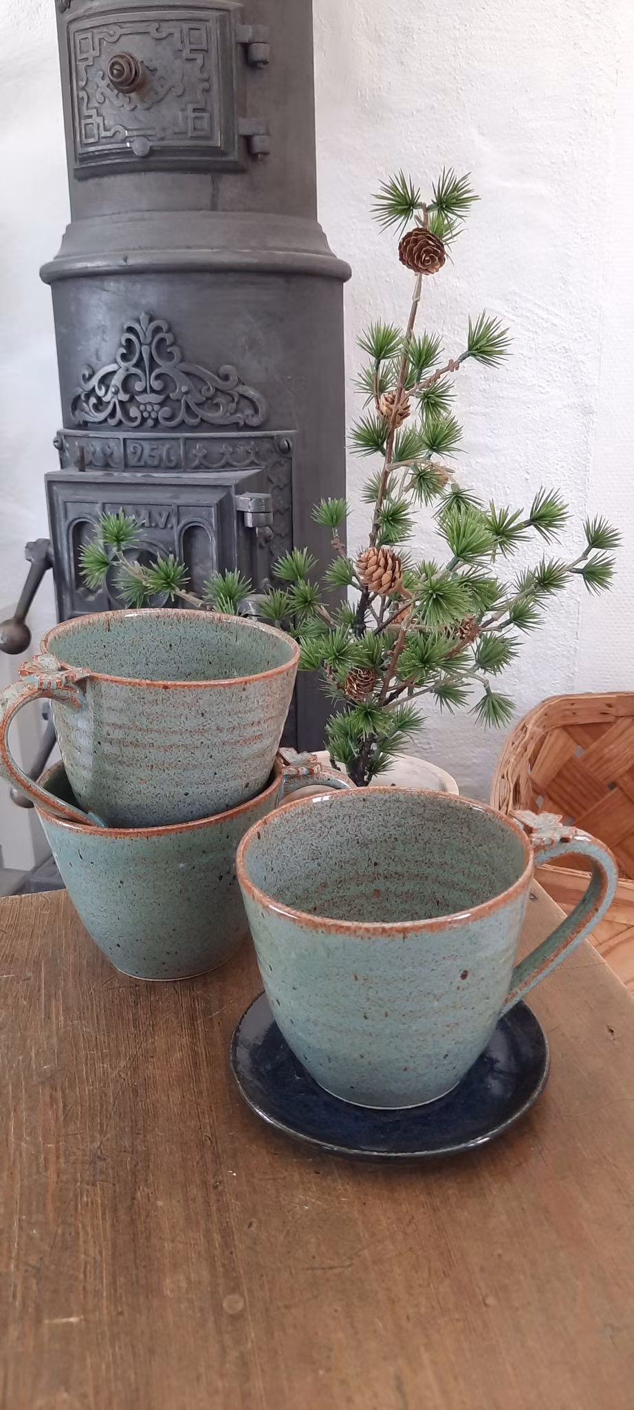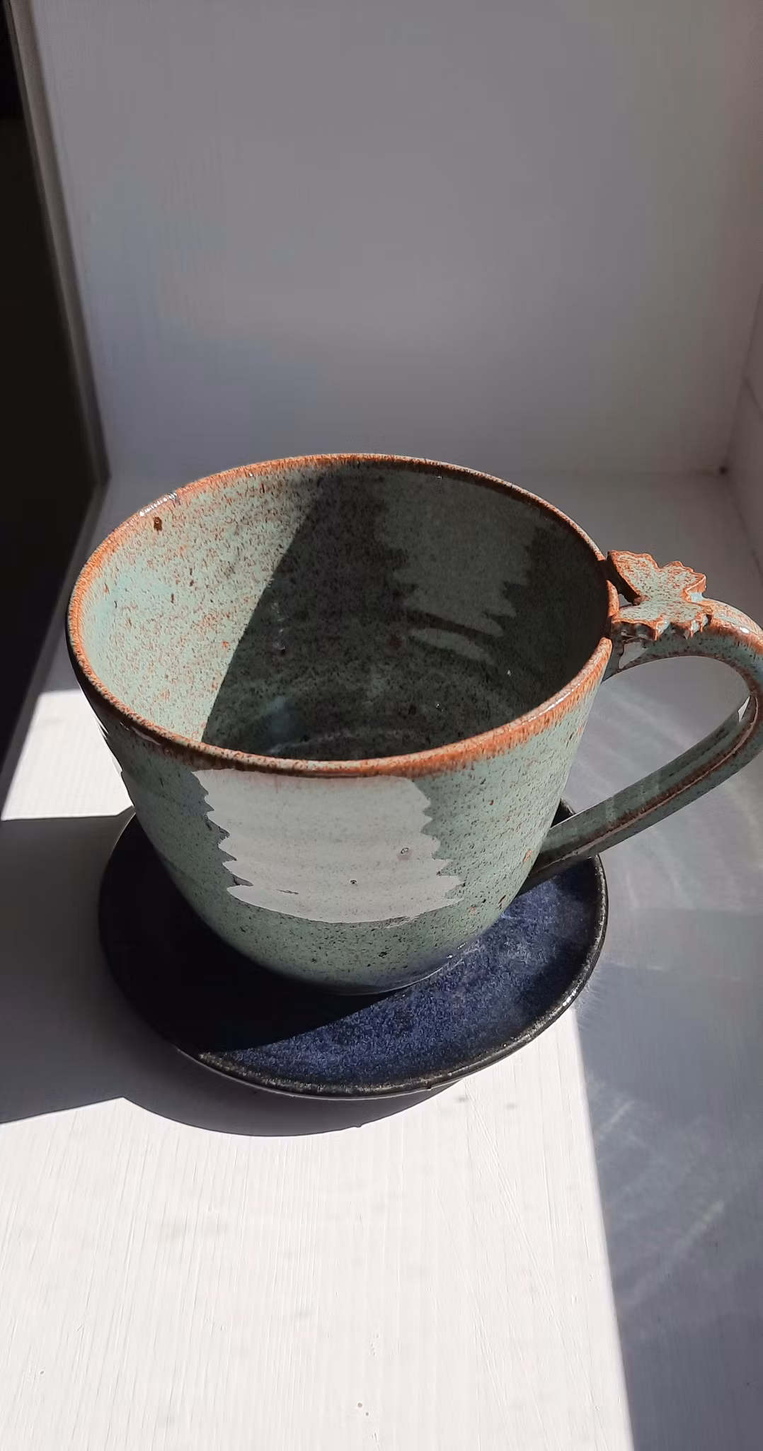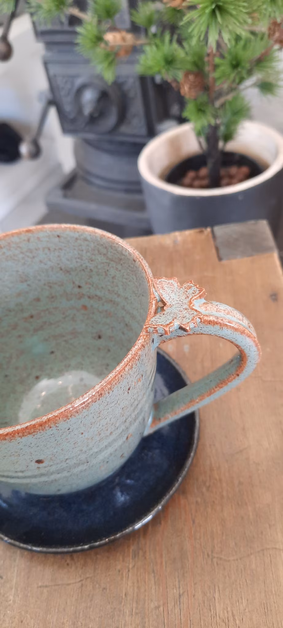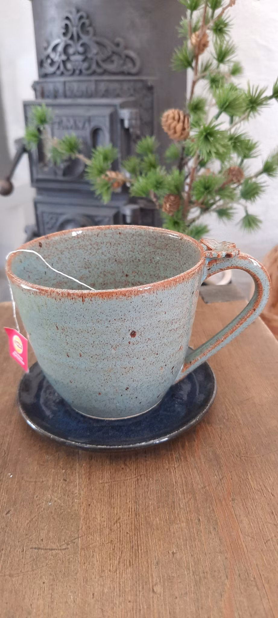 Stor kopp i steingodsleire. Grønn/ brun farge med sommerfugl på hanken og rommer 4 dl.