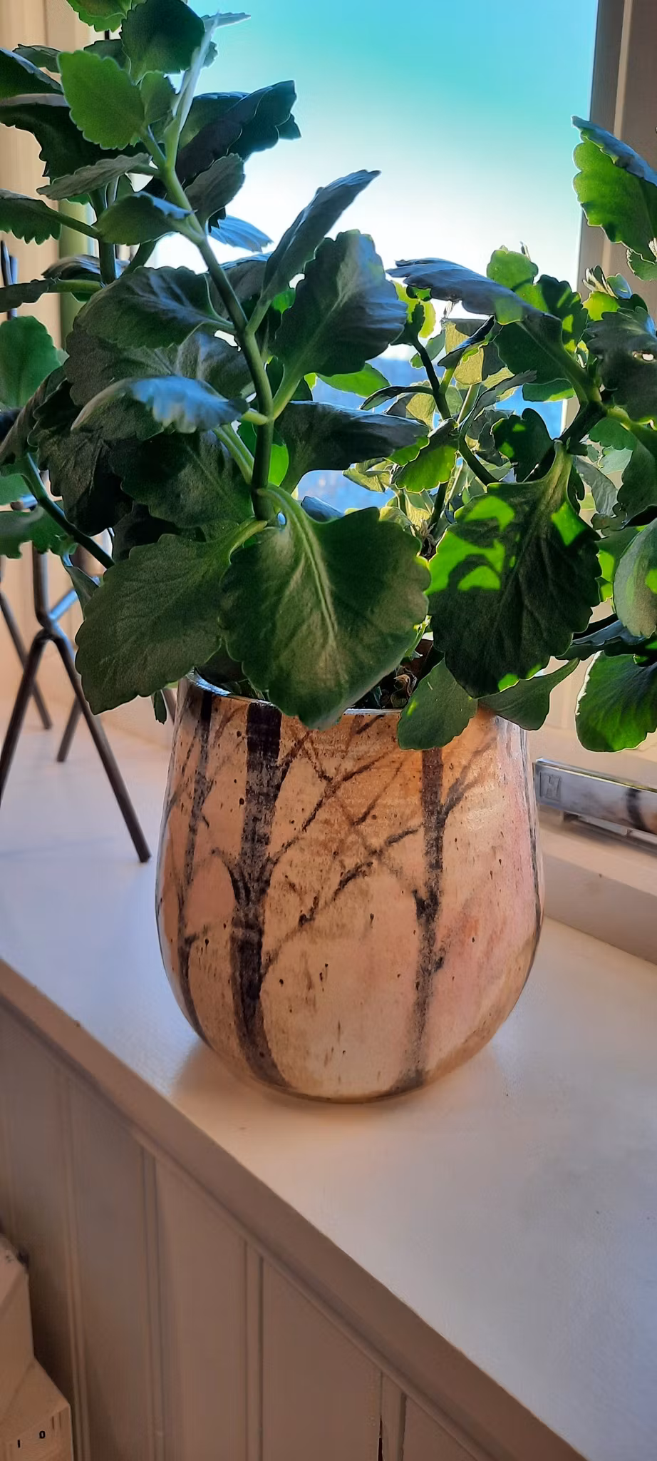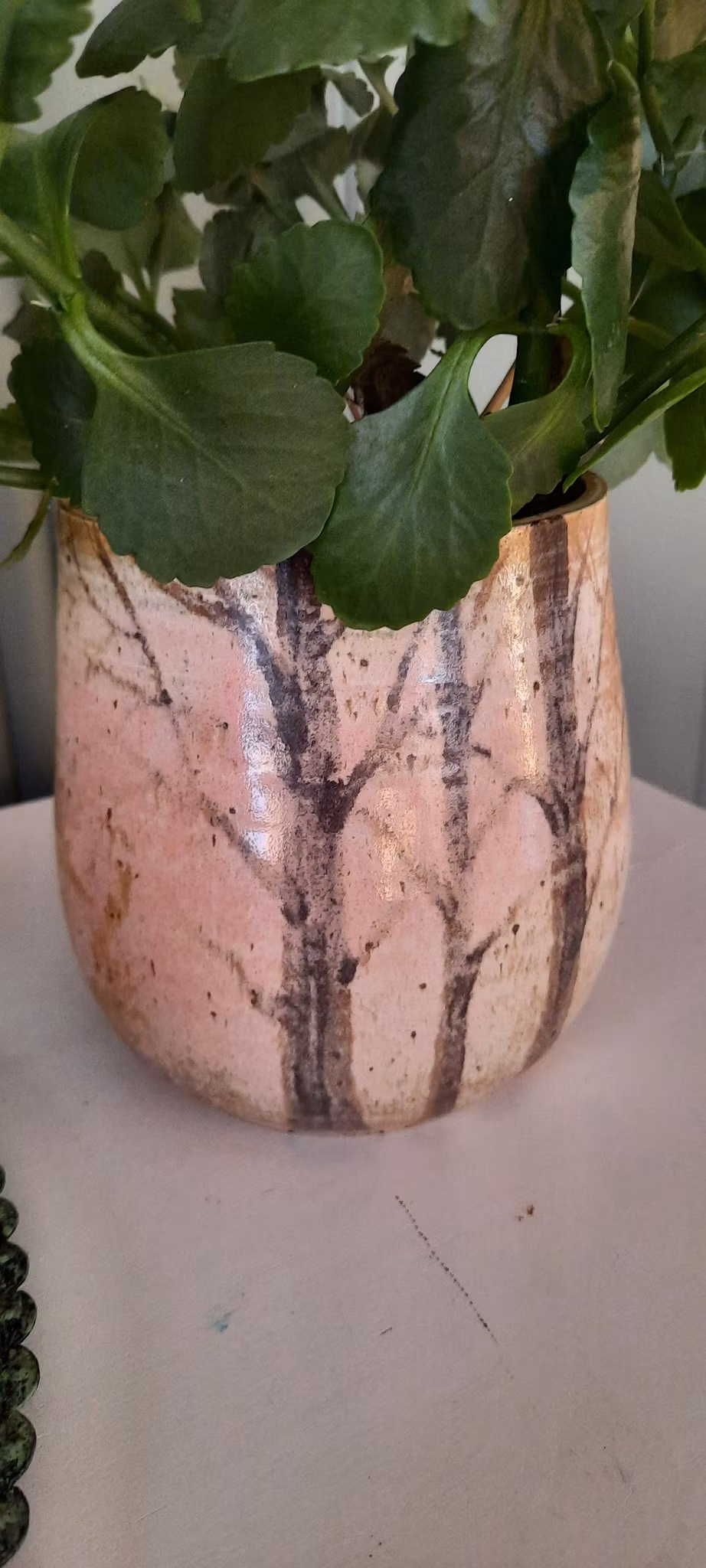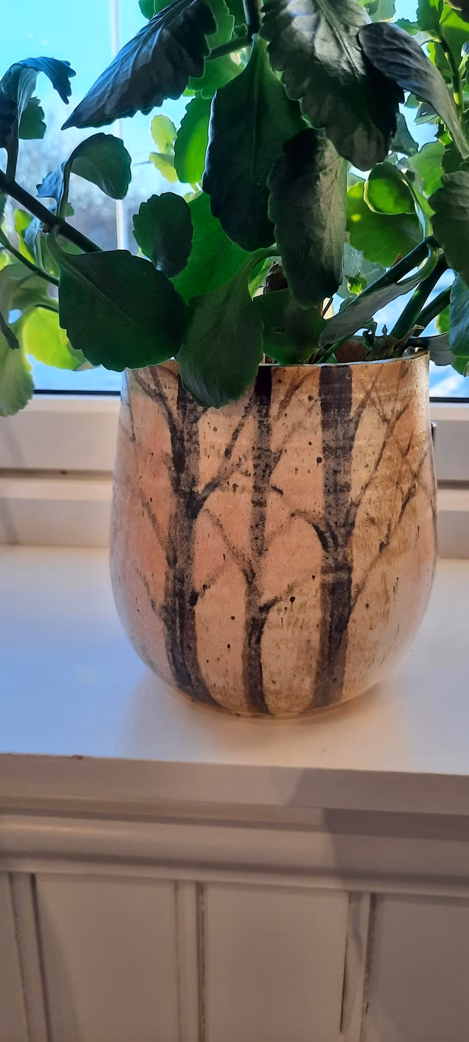 Helt unik blomsterpotte med håndmalte trær som motiver.