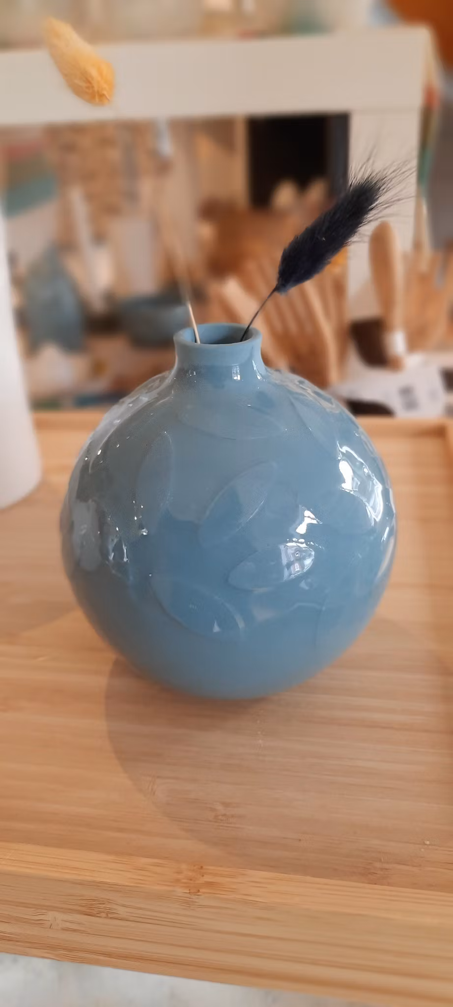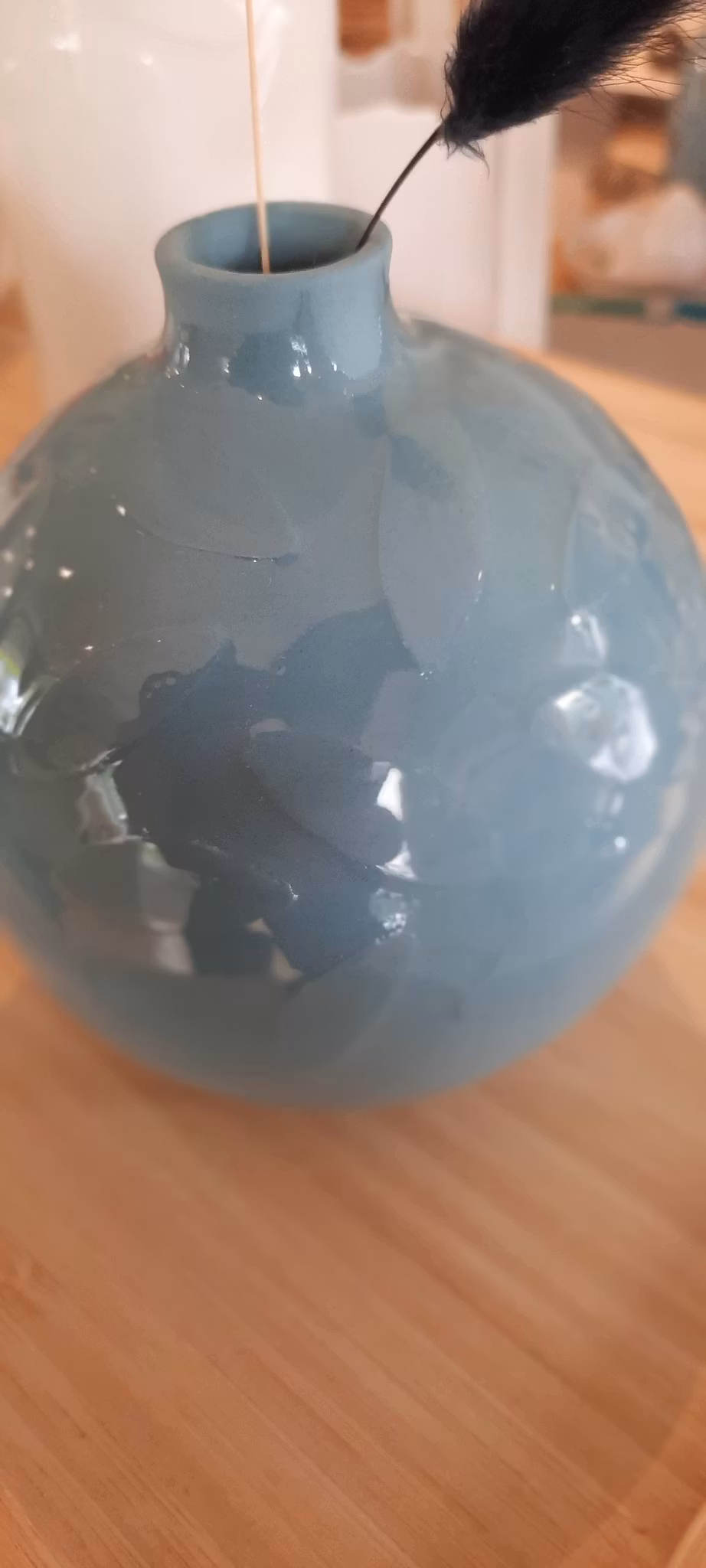 Søt blank petrol farget vase i porselen. Relieff mønster med blader. Fin til strå, sommerblomster, en rose osv