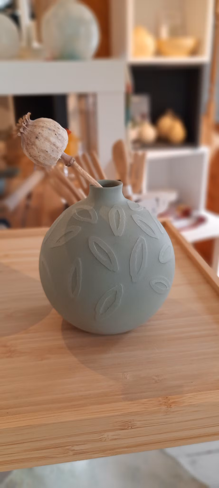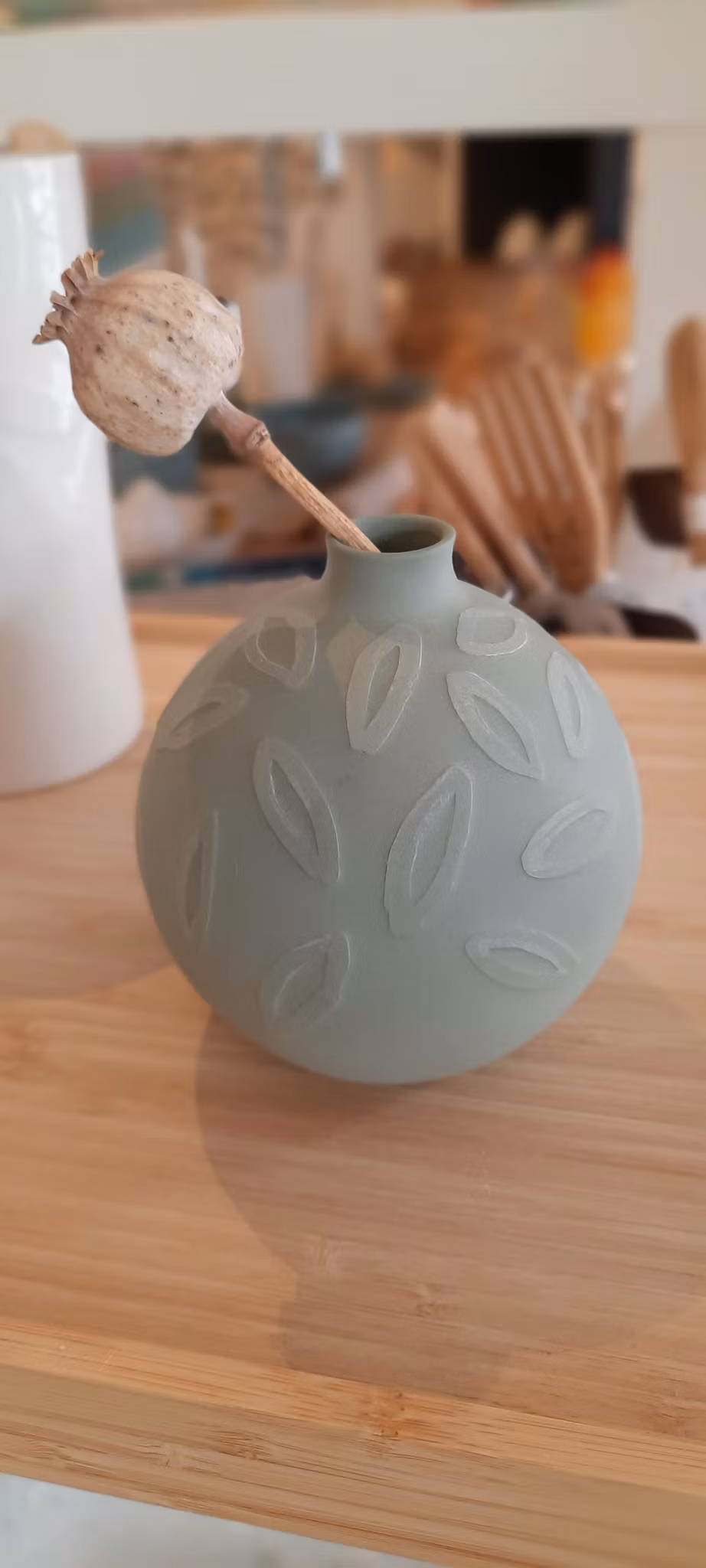 Søt matt grønn vase i porselen. Relieff mønster med blader. Fin til strå, sommerblomster, en rose osv