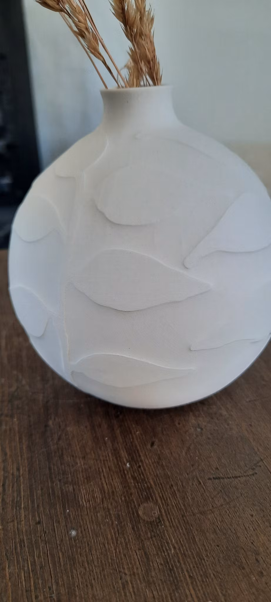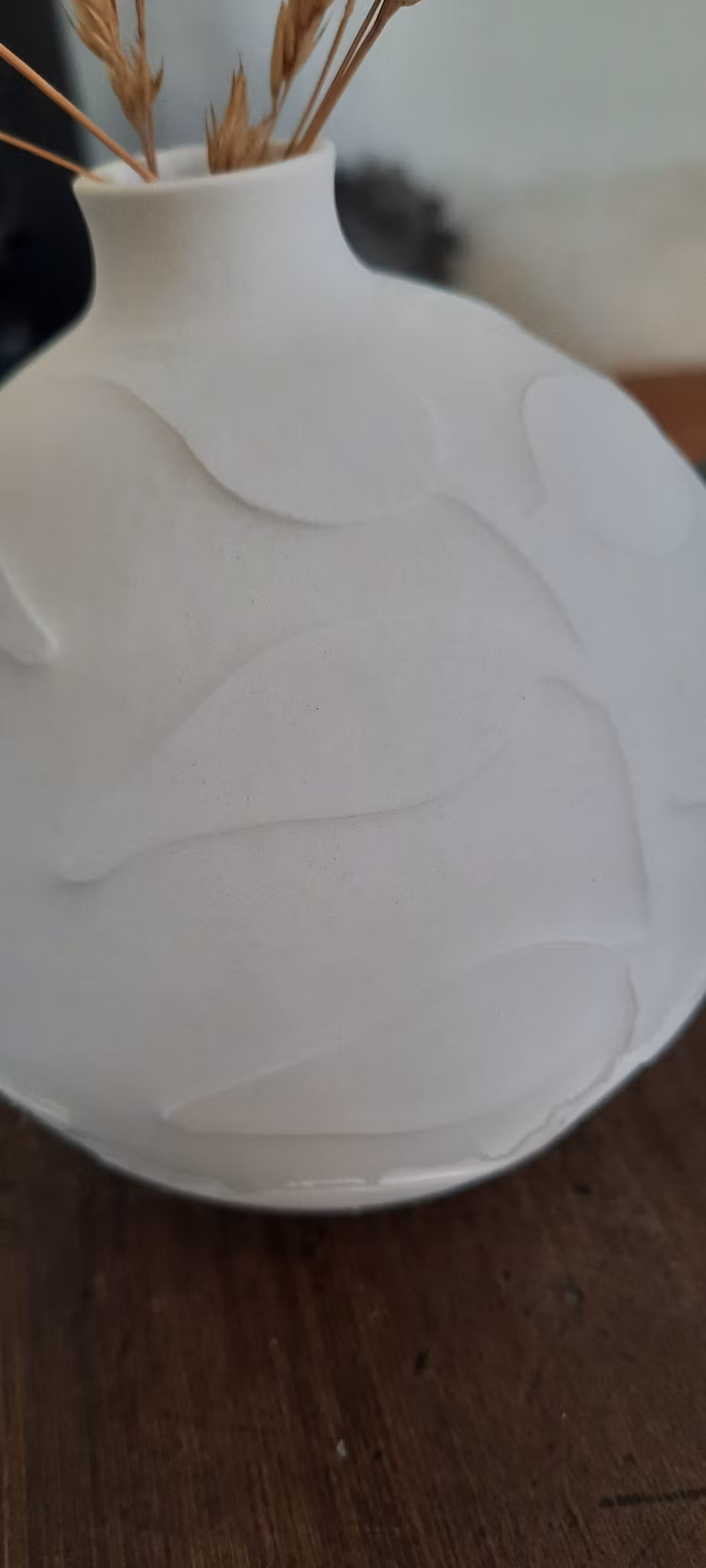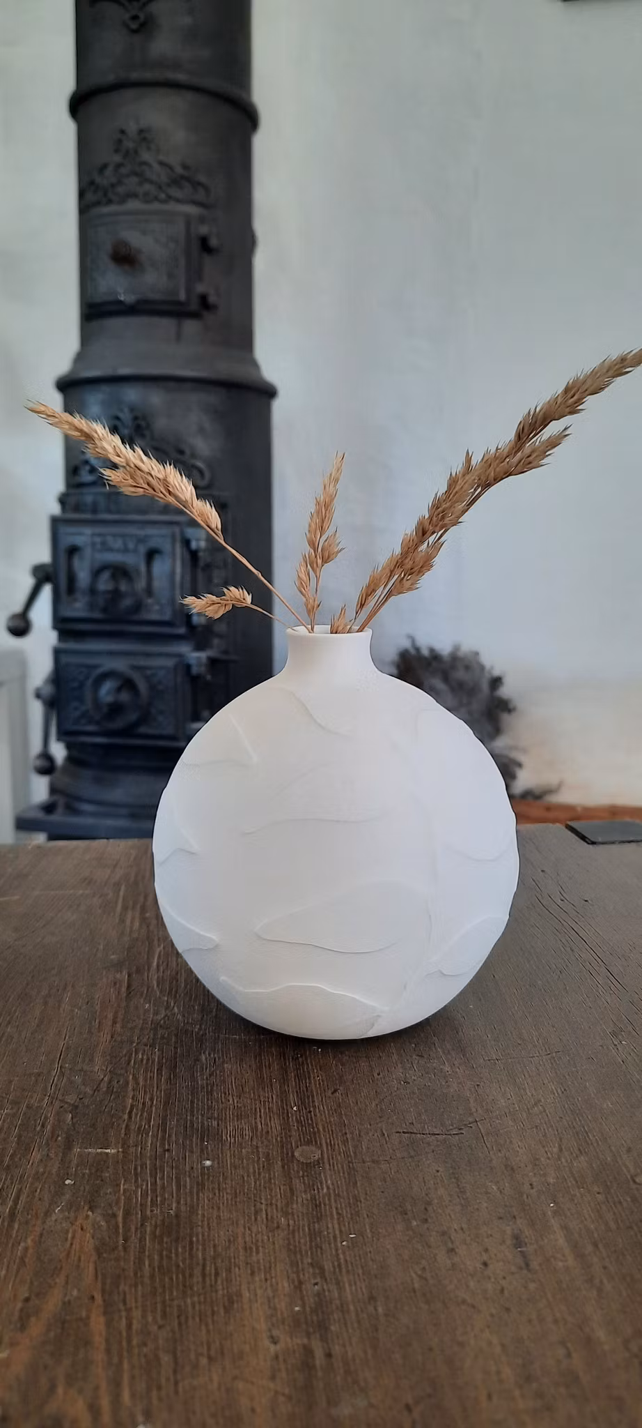 Søt hvit gjennom farget vase i porselen. Relieff mønster med blomsterblad. Fin til strå, sommerblomster, en rose osv