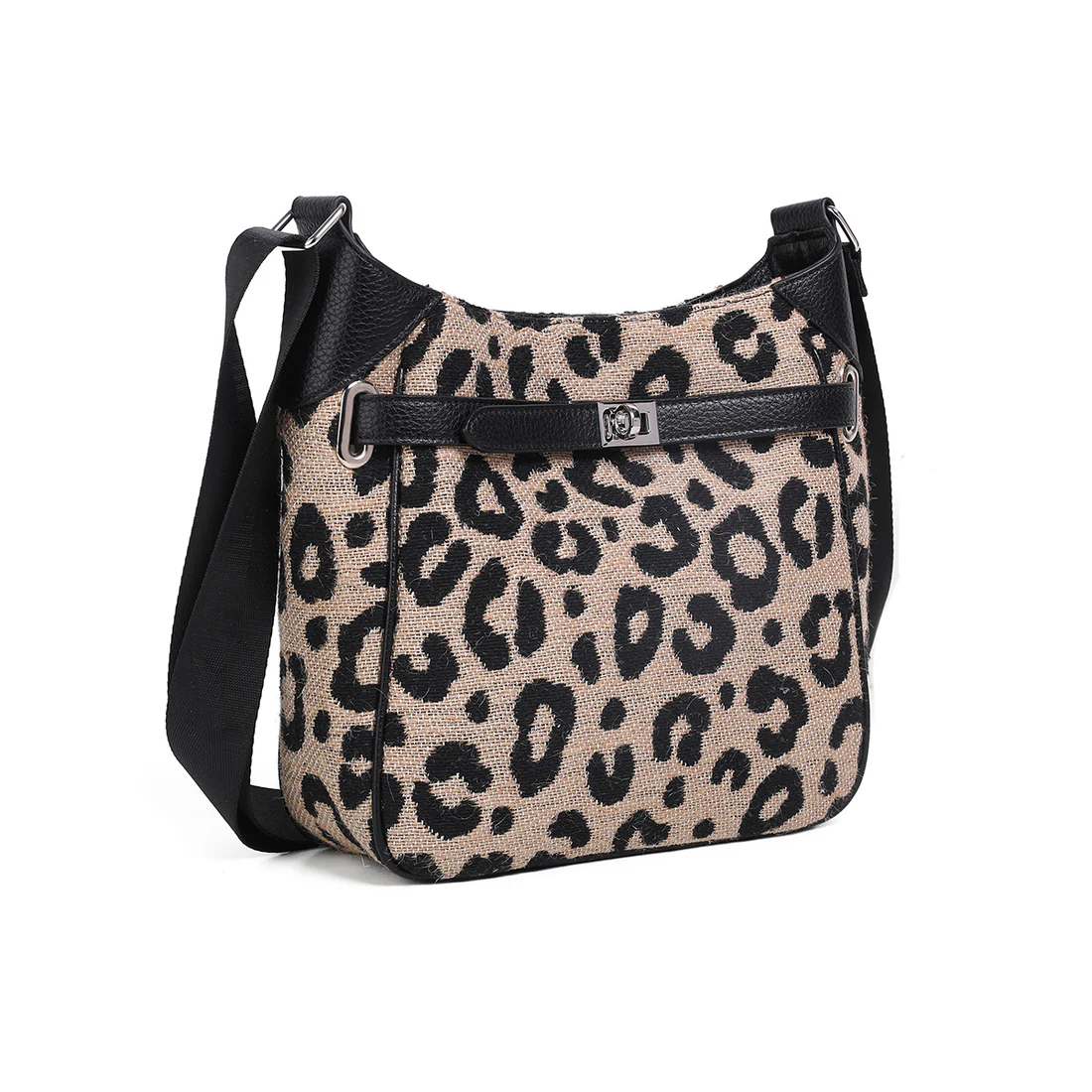 Gry med leo print er et blikkfang i hverdagen. Vesken er laget i kombinasjon av imitert skinn og stoff. kommer med sølvfarget metall og justerbar skulderreim (72-128).