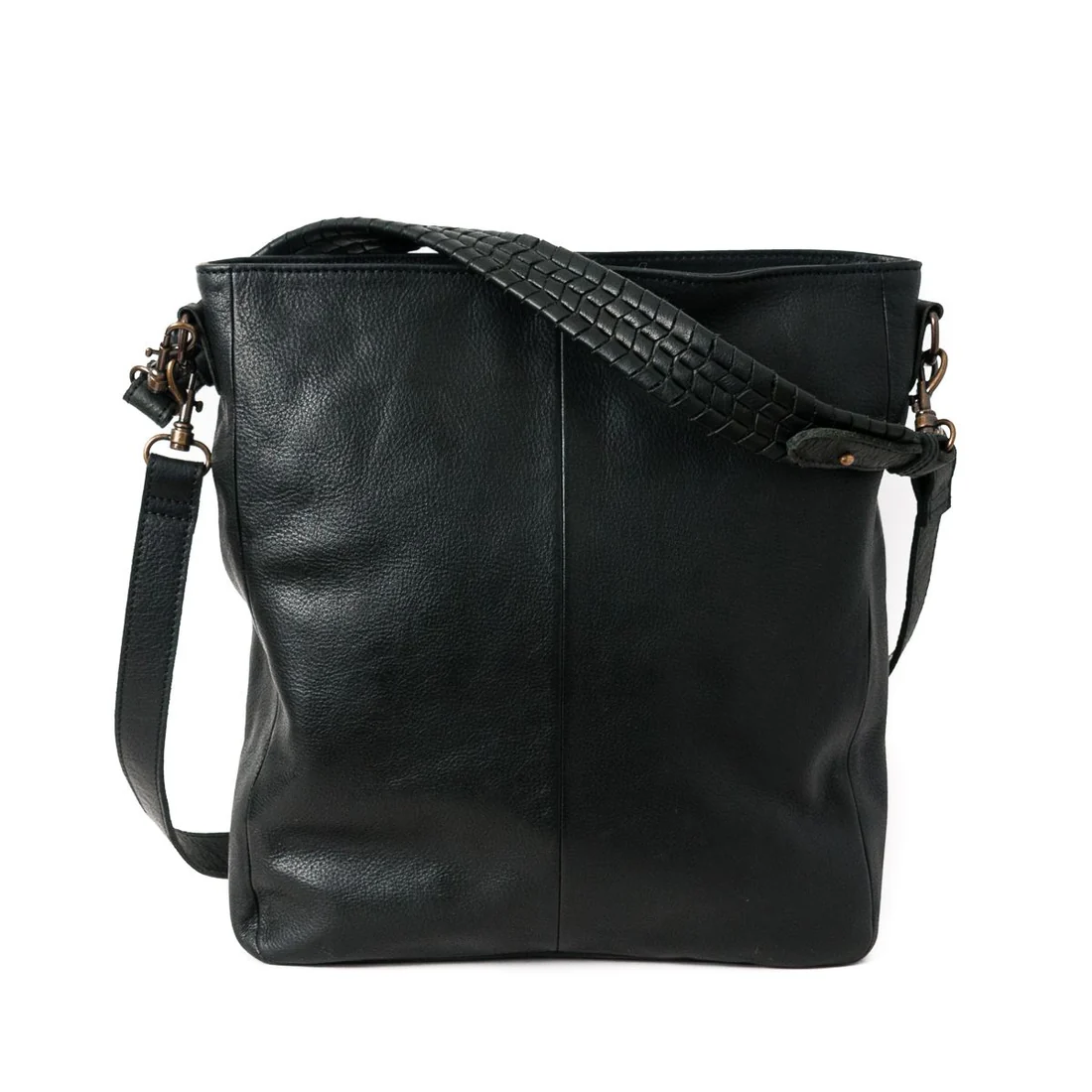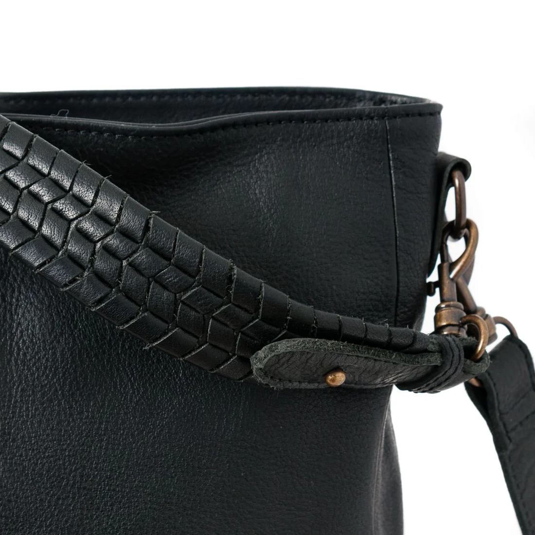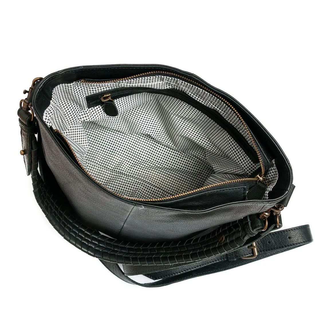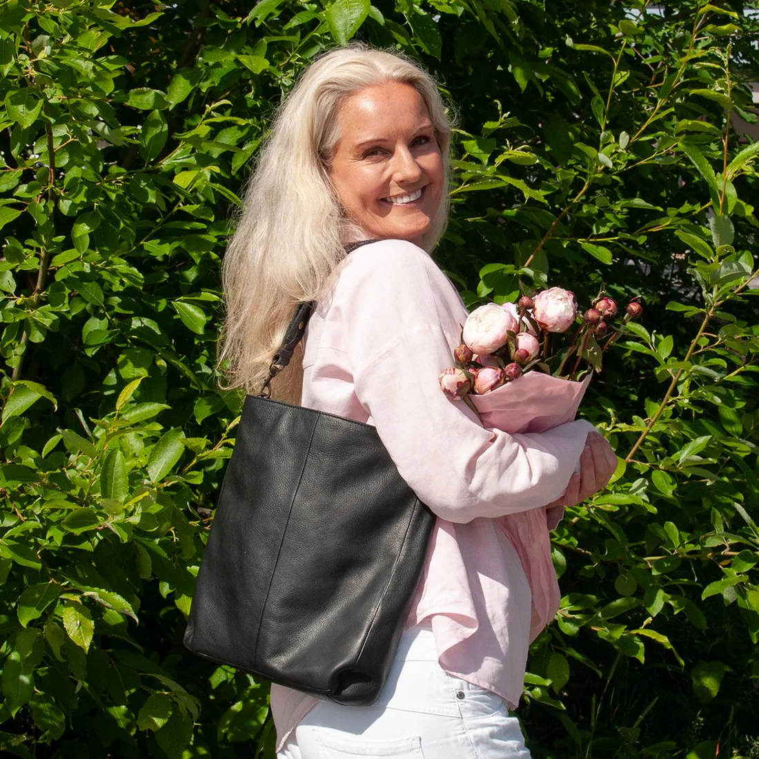 Skinnveske med ett stort rom som lukkes på toppen med glidelås og en innerlomme som lukkes med glidelås. Det innvendige foret har et delikat mønster i 100 % polyester. Det følger med 2 reimer i skinn. En skulderreim hvor lengden kan reguleres så den passer til deg. Og en flettet kortere reim hvis du ønsker å bruke det.