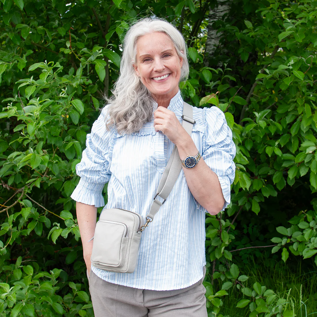 Denne vesken er liten og smart og har plass til det aller mest nødvendige. vesken lukkes på toppen med en glidelås og den har en frontlomme som lukkes med glidelås. det innvendige foret hat et delikat mønster i 100% polyester. Skulderreima matcher veskens farge og lengden kan reguleres så den passer til deg.